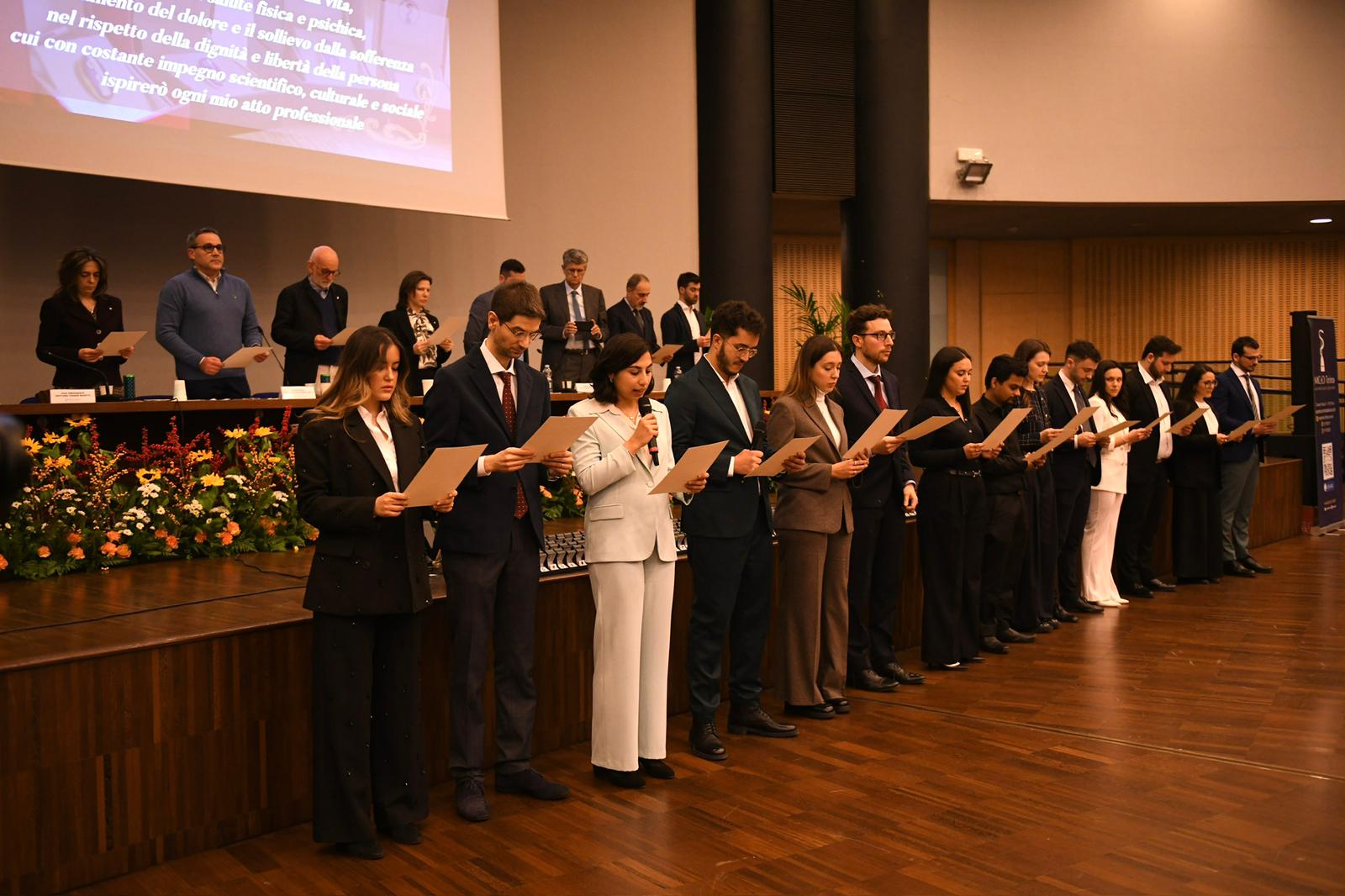I giovani medici hanno prestato giuramento professionale, accompagnati dalla lettura del testo da parte di un gruppo di loro e hanno ricevuto gli auguri del Consiglio direttivo con la consegna del distintivo dell’Ordine da parte dei Consiglieri presenti.