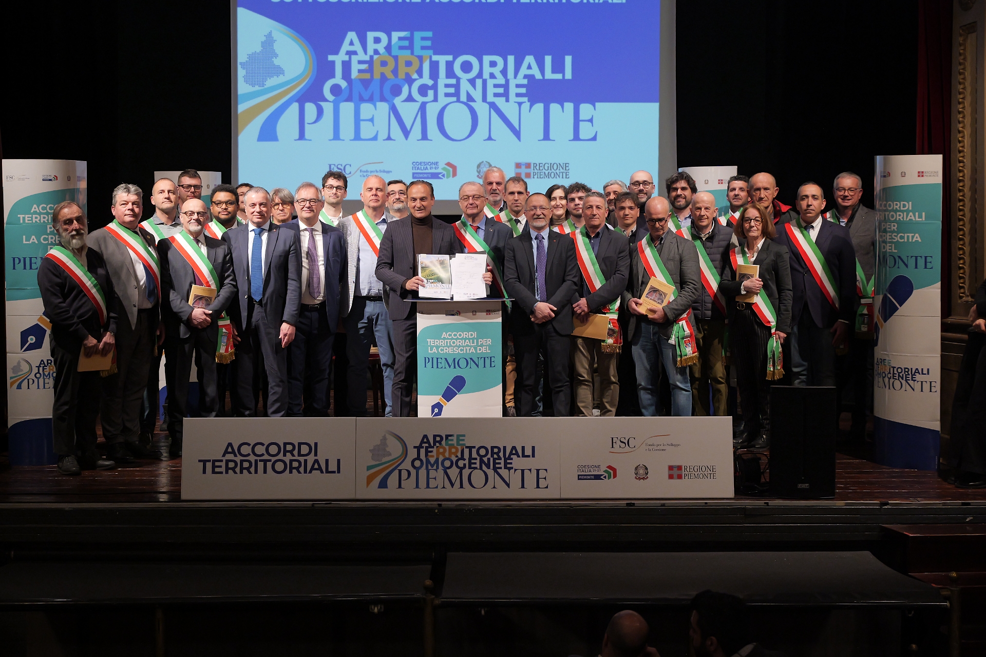 Insieme al presidente Cirio erano presenti l’assessore ai Fondi di Sviluppo e Coesione Gian Luca Vignale, l’assessore alle Aree Interne Marco Gallo, il vicepresidente del Consiglio regionale Franco Graglia e il presidente della Provincia di Cuneo Luca Robaldo. Ma i veri protagonisti della giornata sono stati i sindaci, chiamati uno a uno sul palco del teatro per la firma ufficiale degli accordi.