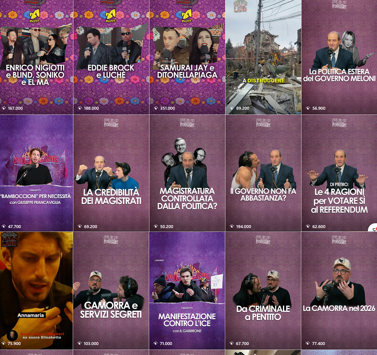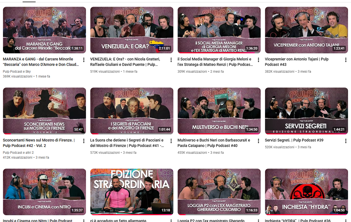 In poco più di un anno, Pulp Podcast ha superato la quota di 300 mila iscritti, mettendo a segno numeri di visualizzazione altissimi: la puntata con Roberto Vannacci ha raggiunto 1,8 milioni di views, quella dedicata alla Banda della Magliana 1,4 milioni.