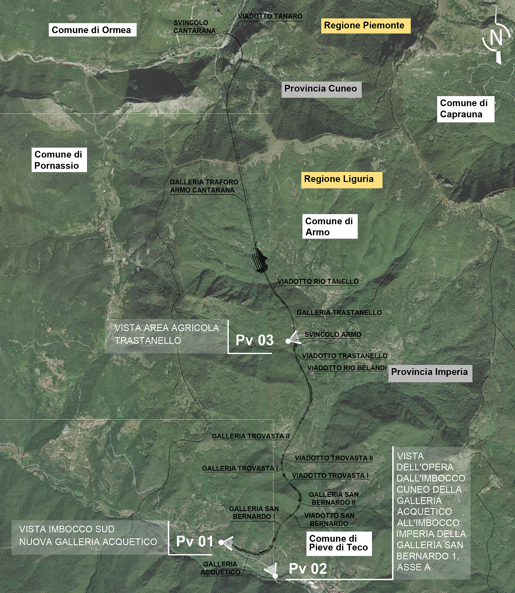 «Il tracciato – si legge ancora nella relazione al progetto – si inserisce in un ambito prevalentemente boscato e morfologicamente complesso, caratterizzato da versanti incisi, coperture forestali continue e limitate presenze insediative, sviluppandosi dalla zona di Acquetico, attraversando i nuclei di Trovasta e di Trastanello, fino all’intervento di rimodellamento morfologico e sviluppo in galleria per poi terminare tramite un superamento del fiume Tanaro in prossimità di Cantarana.