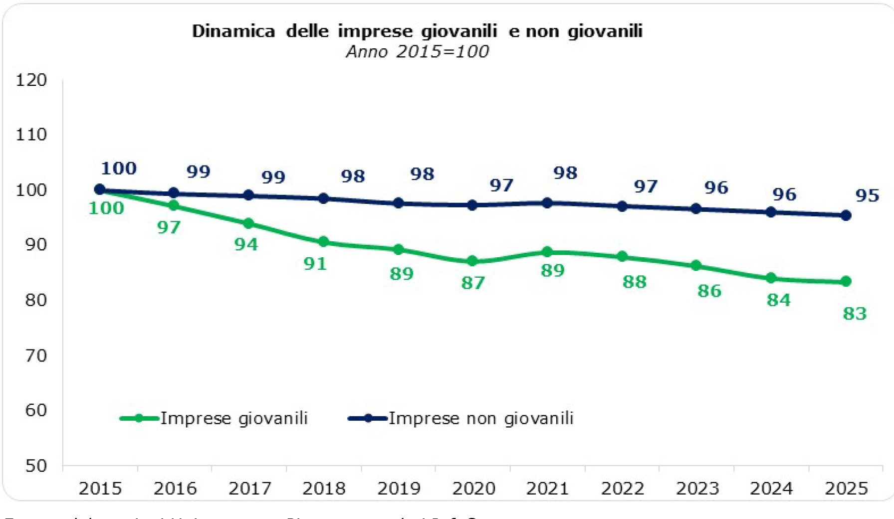 Tale andamento è riconducibile alla convergenza di due fattori: da un lato la cessazione di parte delle attività guidate da giovani; dall’altro il fisiologico superamento della soglia anagrafica da parte dei titolari d’azienda, che fuoriescono dal perimetro statistico degli under 35 senza che, sul fronte opposto, il ricambio generazionale sia riuscito a colmare integralmente il divario con nuove aperture.