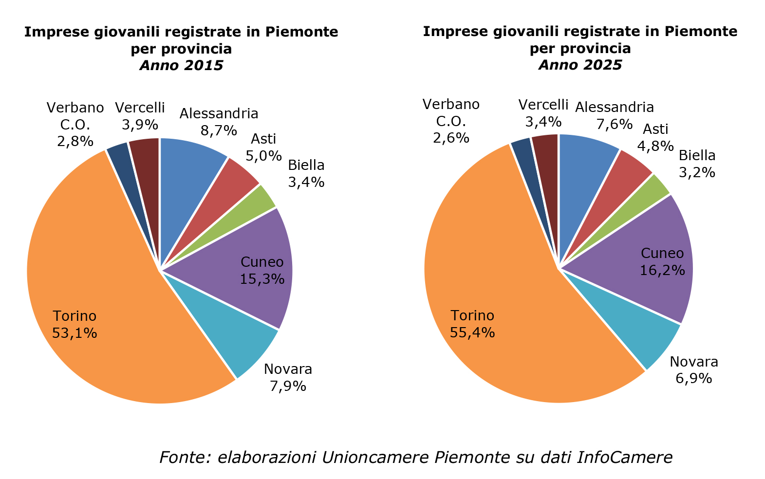 Spostando, infine, l'osservazione sui singoli territori, la flessione della componente giovanile appare diffusa sull'intero perimetro regionale, seppur con gradienti d'intensità variabili. Le province di Vercelli, Alessandria, Novara e Verbano-Cusio-Ossola registrano le contrazioni più marcate, con una base imprenditoriale under 35 che si è ridotta di oltre un quarto rispetto a dieci anni fa. Al contrario, Torino e Cuneo emergono come i poli più resilienti del Piemonte, avendo contenuto l'erosione del tessuto produttivo giovanile entro soglie decisamente più ridotte rispetto alla media degli altri territori.