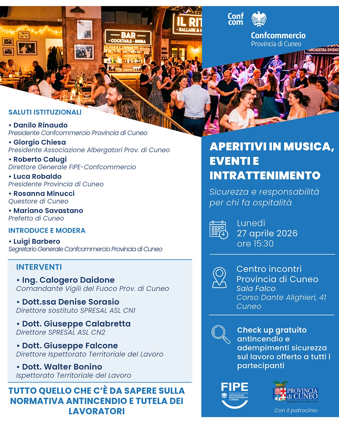 Nasce da questa esigenza l’incontro “Aperitivi in musica, eventi e intrattenimento – Sicurezza e responsabilità per chi fa ospitalità”, in programma lunedì 27 aprile 2026 alle ore 15.30 presso il Centro Incontri della Provincia di Cuneo – Sala Falco.