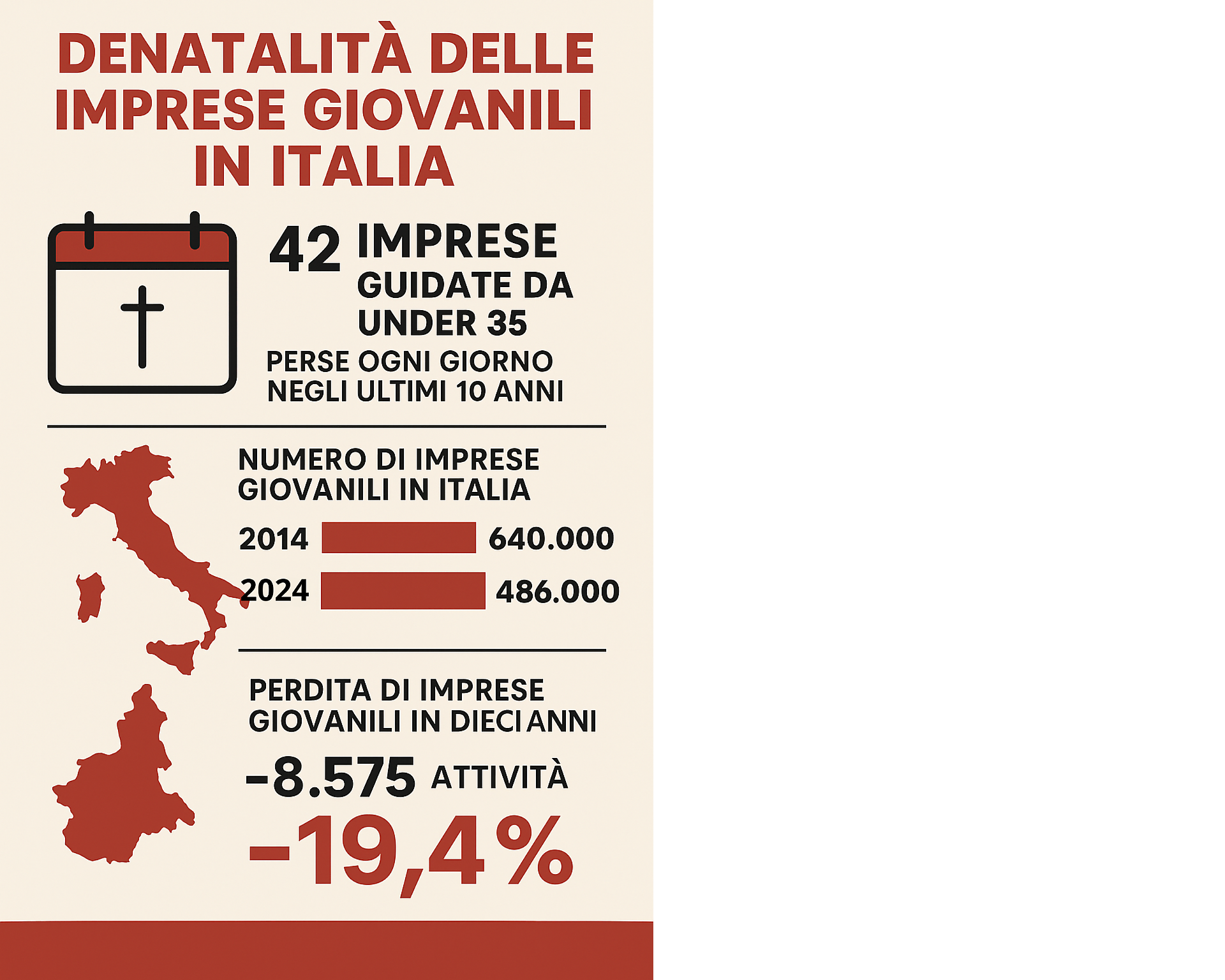 In Italia sta scomparendo silenziosamente una generazione di imprenditori. A denunciarlo con forza è CNA Piemonte, che parla apertamente di “denatalità d’impresa”, un fenomeno che sta colpendo il tessuto produttivo nazionale e regionale in modo costante da oltre dieci anni. Secondo i dati diffusi da Unioncamere, il nostro Paese ha perso 42 imprese giovanili al giorno nell’ultimo decennio.