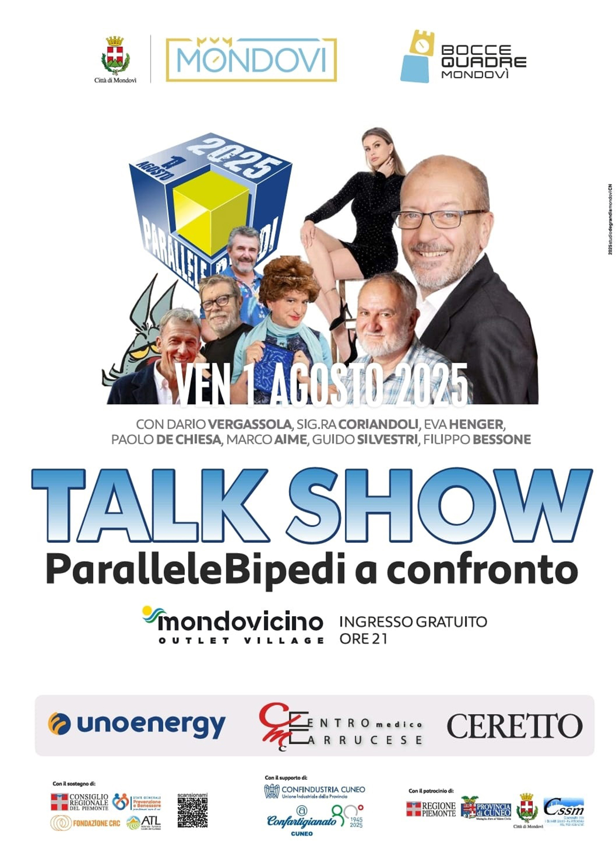 Lo spettacolo condotto da Dario Vergassola vedrà sul palco diversi personaggi che si confronteranno raccontando le loro storie fatte di sacrifici e successi e, qualche volta, cambi di traiettoria inaspettate della loro vita proprio come le bocce quadre. A dialogare con Vergassola ci saranno volti noti del mondo dello sport, dello spettacolo, della cultura e della comicità: da Paolo De Chiesa, ex campione di sci e oggi stimato opinionista sportivo RAI, a Eva Henger, showgirl e conduttrice di grande energia e versatilità; da Emma Coriandoli, alter ego di Maurizio Ferrini, indimenticabile icona dell’umorismo televisivo italiano, al raffinato intellettuale Marco Aime, antropologo e saggista, fino alla voce irriverente e satirica delle Langhe rappresentata da Filippo Bessone e, appunto, il amestro del fumetto italiano Silver.