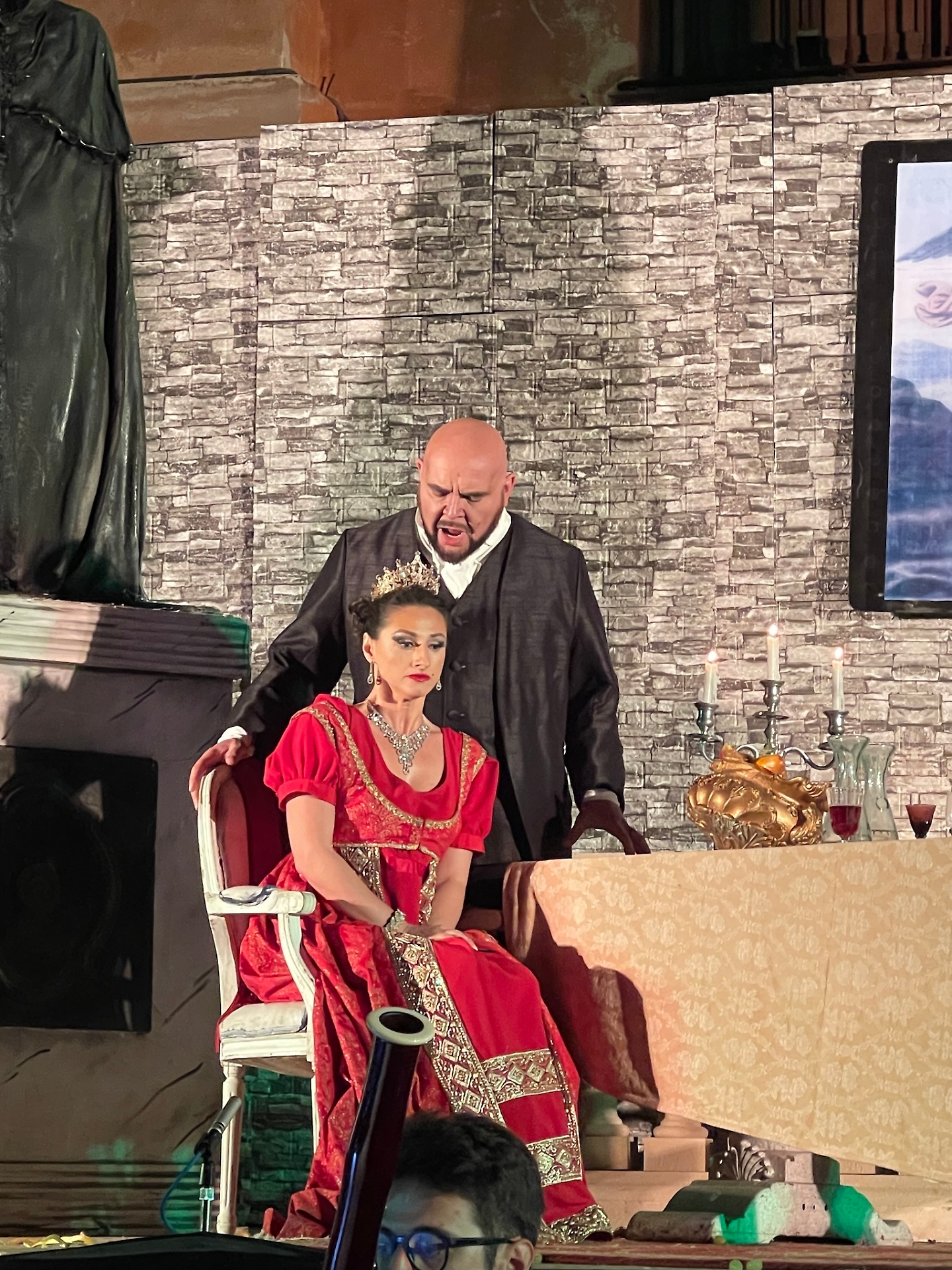 Nel ruolo della protagonista, il soprano Samantha Sapienza offre una Tosca di grande nobiltà vocale e finezza interpretativa. La linea di canto si articola con estrema naturalezza, sostenuta da un’emissione salda e da un controllo dinamico esemplare: il timbro, pastoso e luminoso, resta omogeneo su tutta la gamma. La sua “Vissi d’arte” è fraseggiata con un’intelligenza musicale che privilegia la dolcezza al virtuosismo, la verità emotiva alla retorica. Accanto a lei, il tenore Vladimir Reutov è un Mario Cavaradossi di intensa e giovane vitalità. La voce, naturalmente lirica, si espande con sicurezza e calore, modellando con gusto tutte le grandi pagine del ruolo: “Recondita armonia” si distingue per morbidezza d’attacco e legato sostenuto, mentre “E lucevan le stelle” nel terzo atto risuona come un ultimo canto del cuore, eseguito con squisita sensibilità e con un controllo del fiato da manuale. Il fraseggio è curato e mai compiaciuto, e l’interpretazione attoriale, giocata su gesti sobri e sguardi espressivi, comunica una genuina simpatia, una sorta di naturalezza borghese che ben si addice al pittore rivoluzionario.