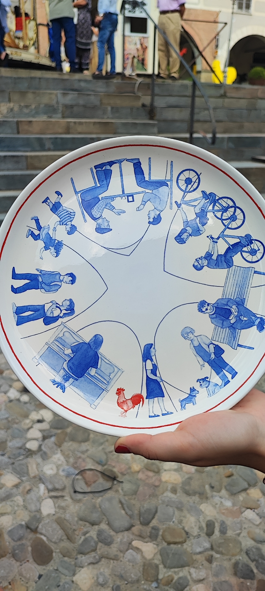 Quel disegno, che rappresenta chi ama Mondovì Piazza e la vive, è dedicato a lei: Sabine Szymanowicz, ex presidente degli "Amici di Piazza", morta lo scorso marzo. Un lutto che aveva fulminato la città esattamente cinque anni dopo la tragica morte di suo figlio, il giovane Jean Francois Torelli, 30 anni. A lei è dedicato il piatto in ceramica della Mostra dell'Artigianato 2025: un piatto particolare, diverso dagli altri, che rappresenta una scena di vita quotidiana ovvero il "passeggio" sulla piazza storica.