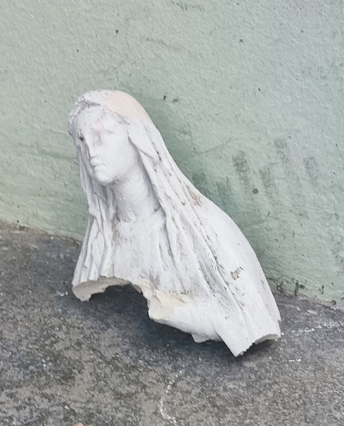 I calcinacci sono ancora in strada: qualcuno, forse anche per precauzione ed evitare danni peggio, ha raccolto quel che resta della statuetta e l'ha posata vicino all'ingresso di un negozio vuoto.