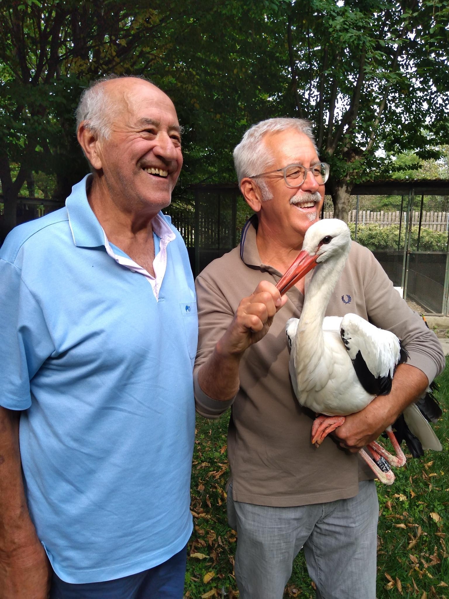 Mauro Fissore con una cicogna in braccio, durante una delle sue visite al Centro di Racconigi