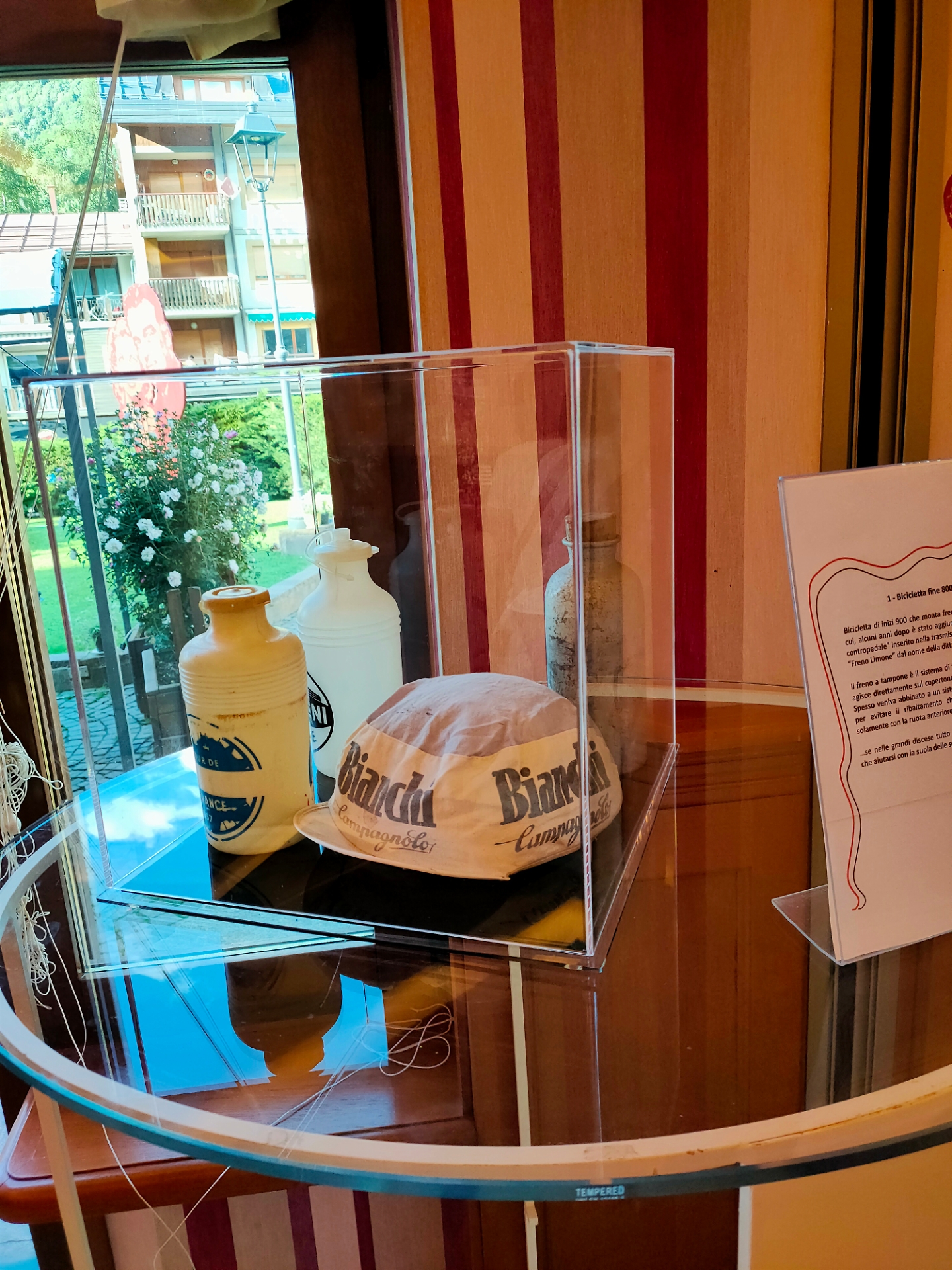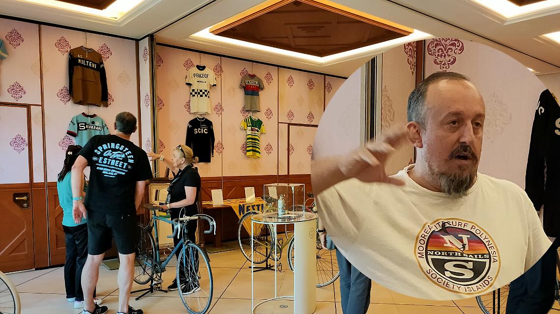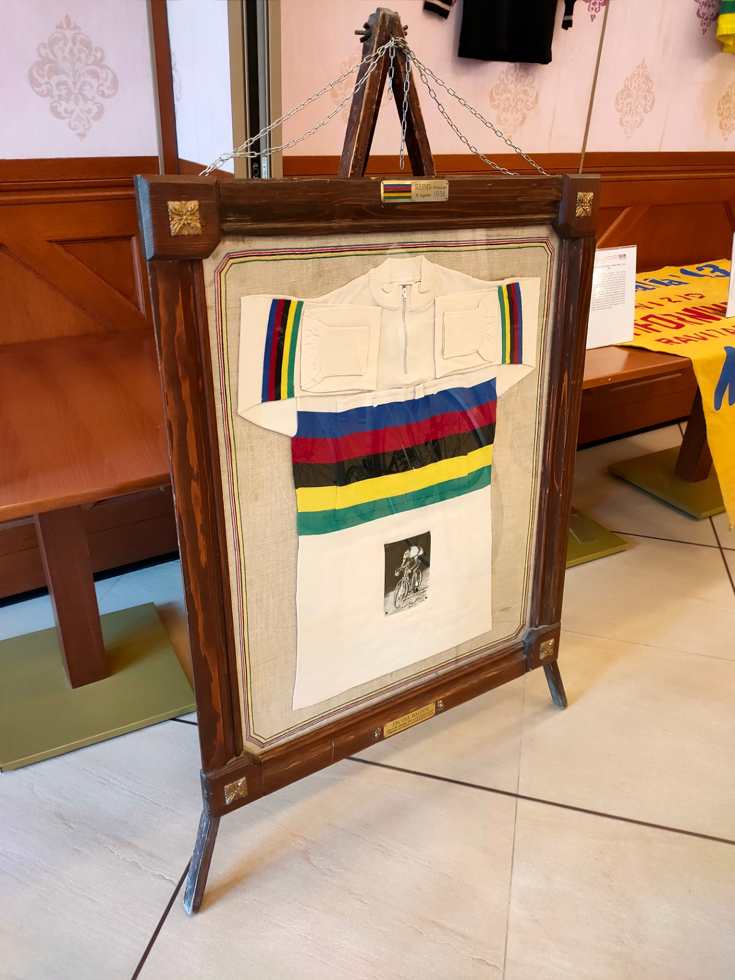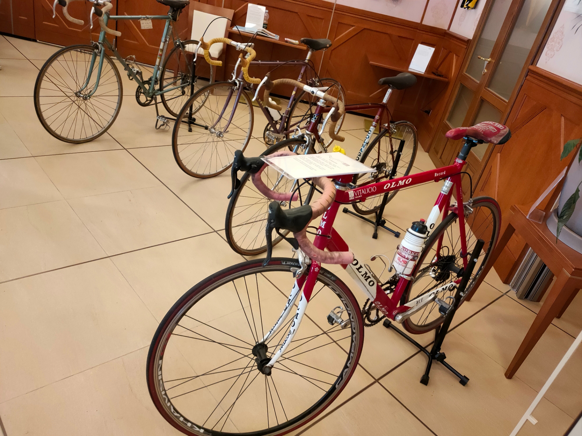 «Sono ormai una ventina di anni che coltivo la passione per la bicicletta d'epoca, i miei genitori avevano un negozio di antiquariato quindi in un certo senso sono nato in questo mondo – racconta Alessandro – io poi ho deciso di dedicarmi particolarmente a questo ambito. La collezione in totale conta più di 100 pezzi, ma qui ho portato le biciclette più rappresentative per l'evoluzione e la storia della bici da corsa dai primi del Novecento. Vediamo qui le prime tipologie di cambio, alcuni modelli rappresentativi come il Campagnolo a due leve che aveva Coppi. I cimeli "Gazzola" testimoniano anche il nostro territorio. C'è anche un telaio "Beltramo", azienda di Torino che aveva la particolarità di saldare senza giunture, una "De Rosa", produttrice importante, una Colnago "Mexico", modello con cui Saronni ha vinto il campionato del mondo e una bici di Prudencio Indurain, fratello di Miguel, modello spagnolo che ho portato in onore della "Vuelta"». La collezione di Ponzo tuttavia va oltre l'ambito strettamente agonistico: «Ho tanti tipi di Grazielle, dalla più piccola a quella a tre posti, altri interessanti modelli da passeggio. E poi ci sono diversi reperti particolari, come queste maglie tra cui c'è la maglia da campione del mondo di Baldini nel 1958, una borraccia del Tour de France del 1948. Nelle vetrine ci sono altri gadget, giochi, fotografie, manifesti... Tutti oggetti che si trovano negli scambi tra i collezionisti, nei mercatini alle aste».