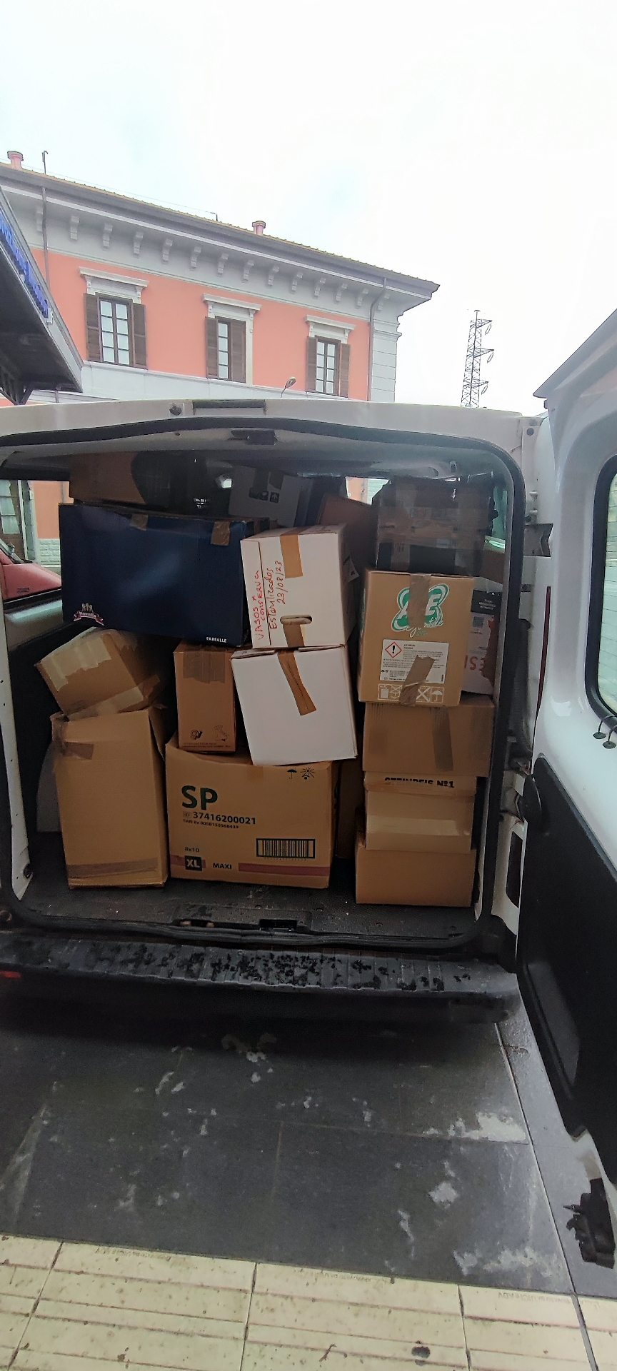 I volontari del "Caffè Sociale" hanno lavorato fino all'ultimo minuto: un pacco dopo l'altro, tutti da dividere, controllare, imballare, caricare. «Partiamo alle 16 puntuali, non possiamo tardare». Ma così tanti pacchi non se li aspettavano forse neanche loro.