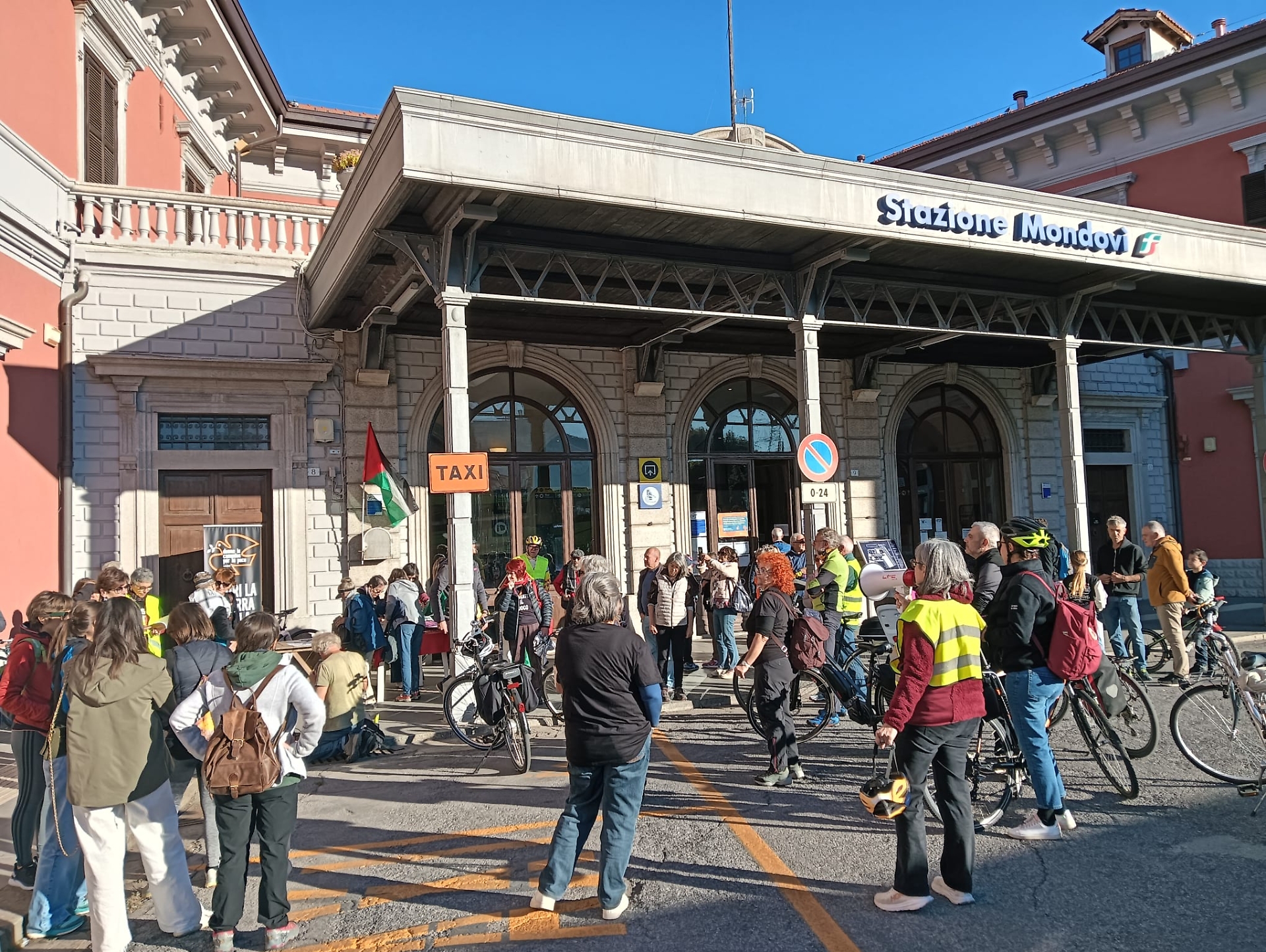 Davanti alla Sala "Scimè" a Mondovì, nel palazzo che durante la Resistenza fu luogo di torture fasciste, Claudia Pinelli ha tenuto l’intervento più intenso della seconda edizione di “Cammina & Pedala per la Pace”, svoltasi domenica 5 ottobre.