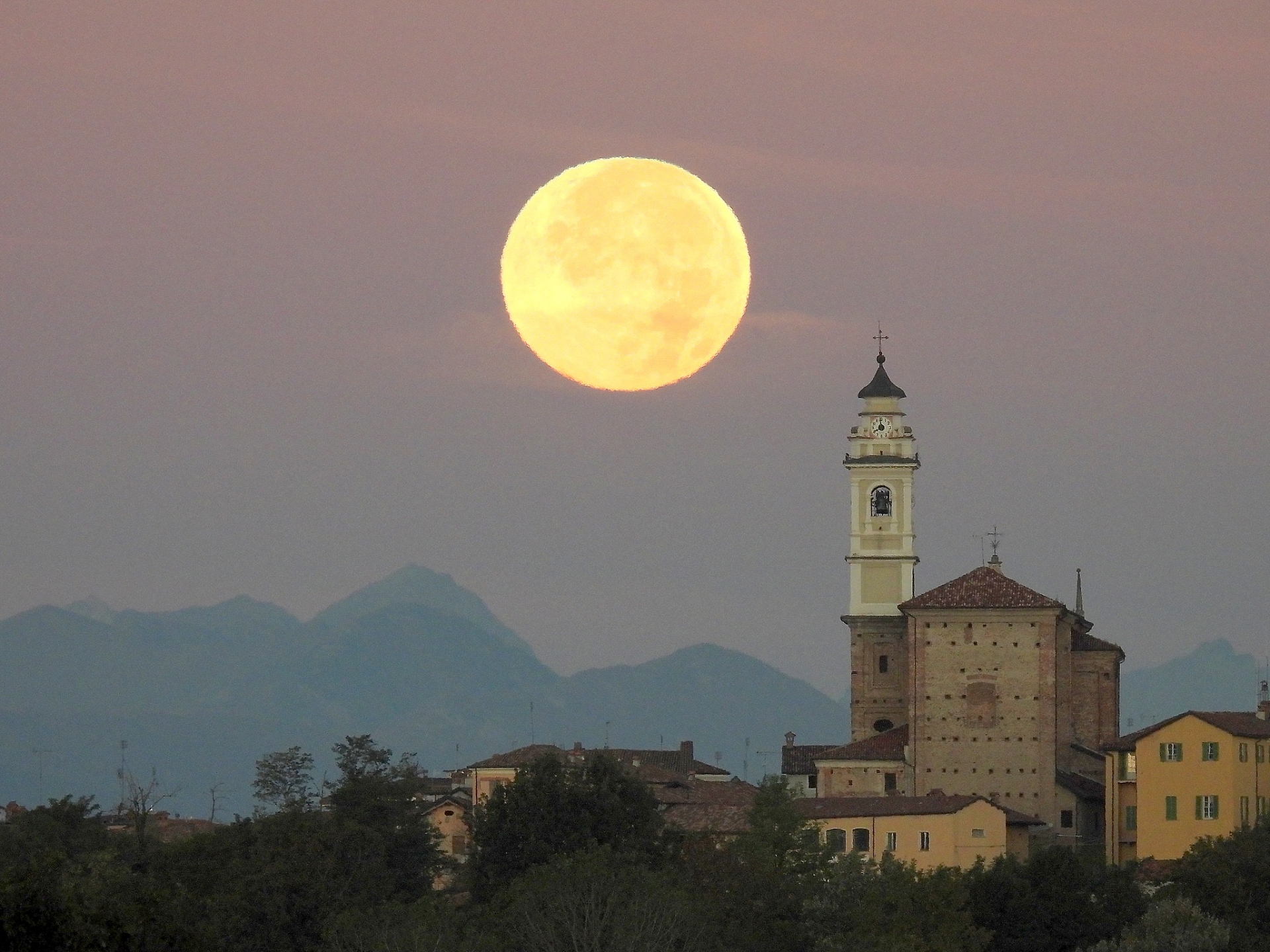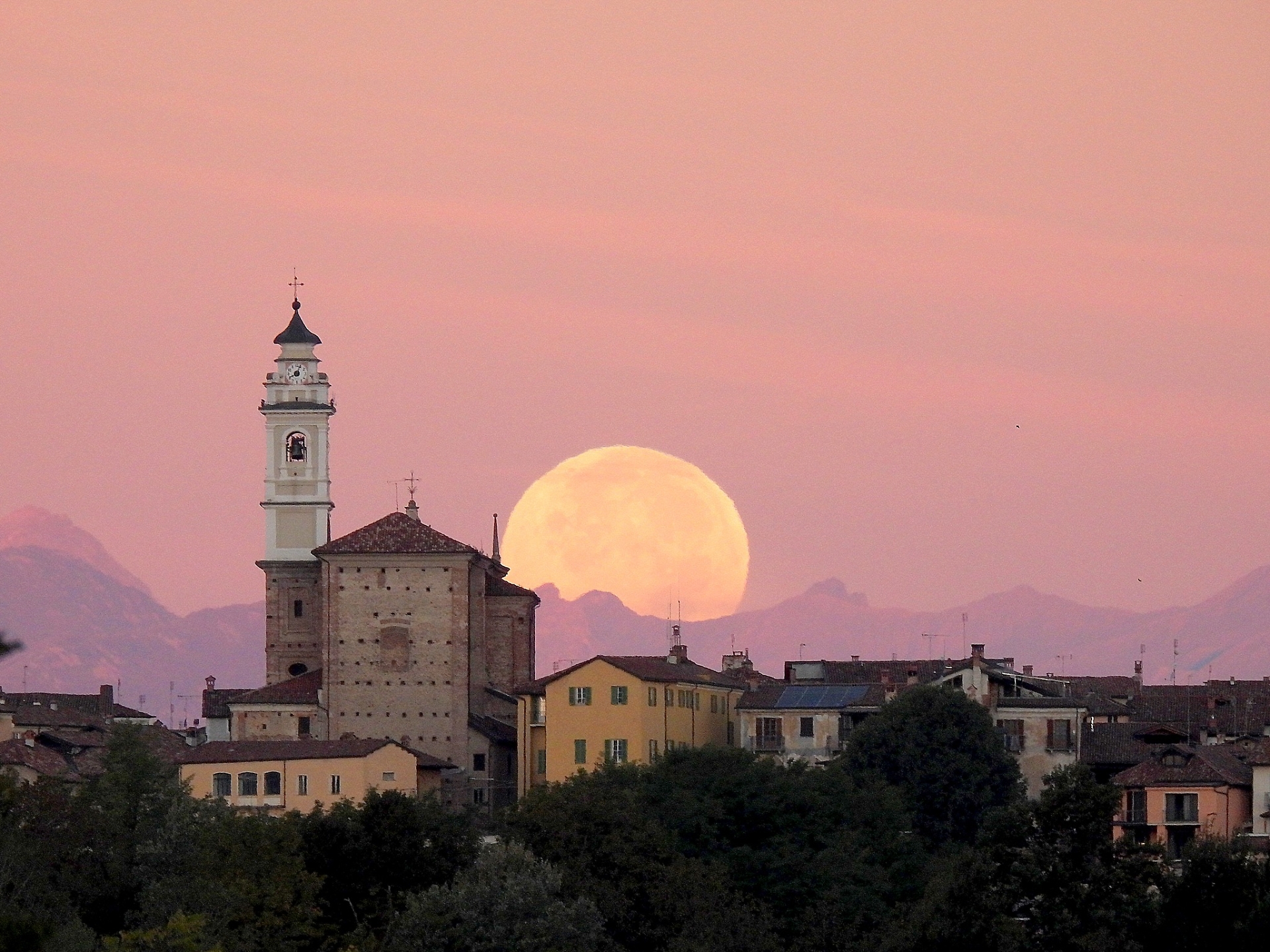 La maxi luna "del cacciatore" dietro la chiesa di Carrù
