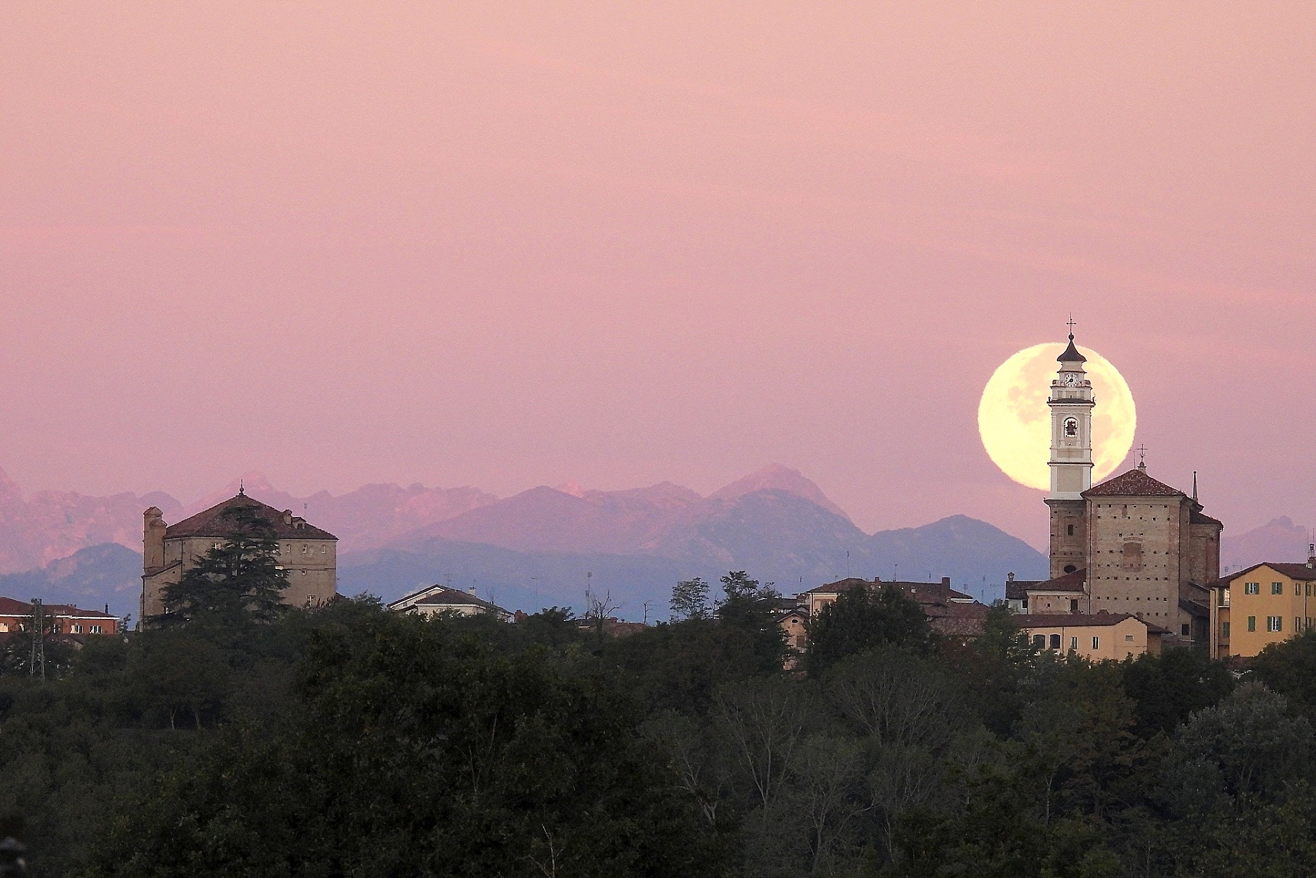 Il fotografo carrucese Marco Aimo ha immortalato il momento con una serie di scatti suggestivi, realizzati proprio all’alba, quando il nostro satellite appariva enorme e luminosissimo sull’abitato.