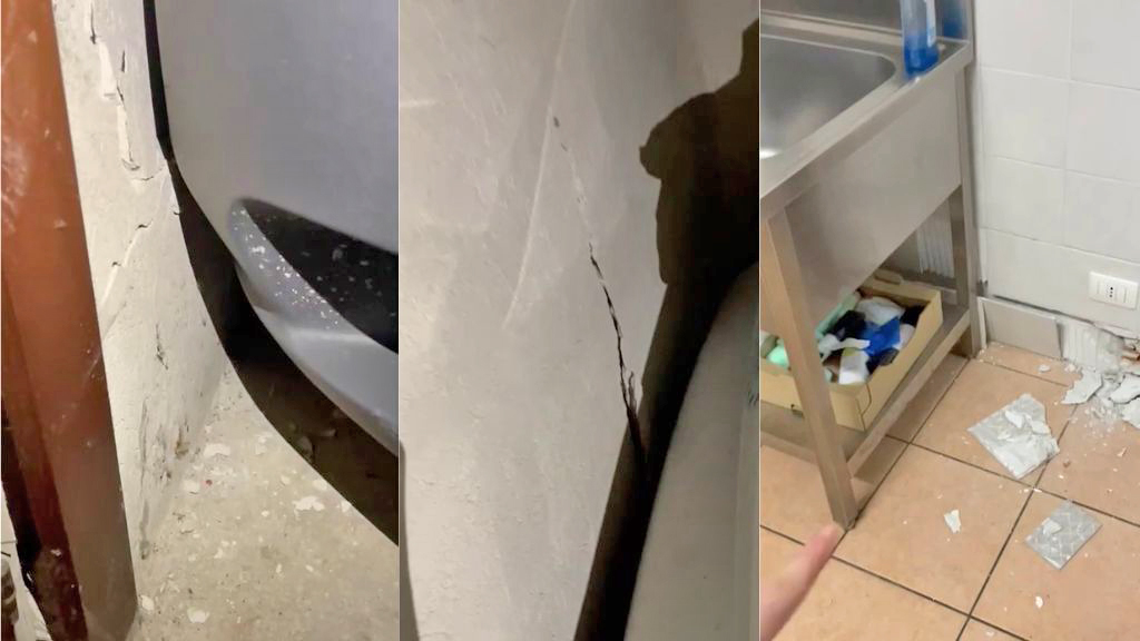 Alcune immagini dei danni riscontrati nel muro adiacente alle cucine