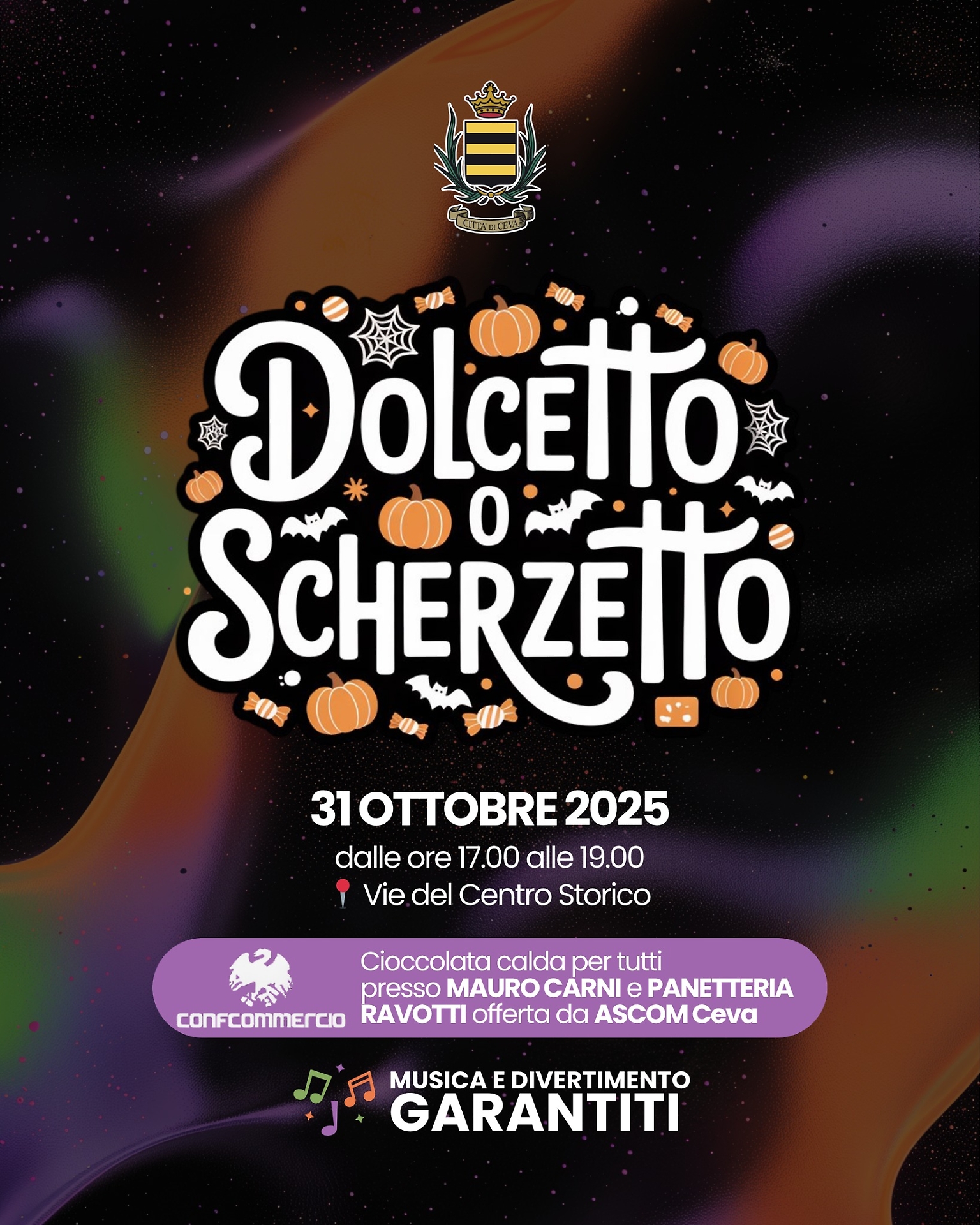 Preparate i costumi più spaventosi (o più dolci ), perché venerdì 31 ottobre 2025 il centro storico di Ceva si trasformerà in un magico villaggio di Halloween pronto ad accogliere streghette, vampiri, piccoli mostri e supereroi!