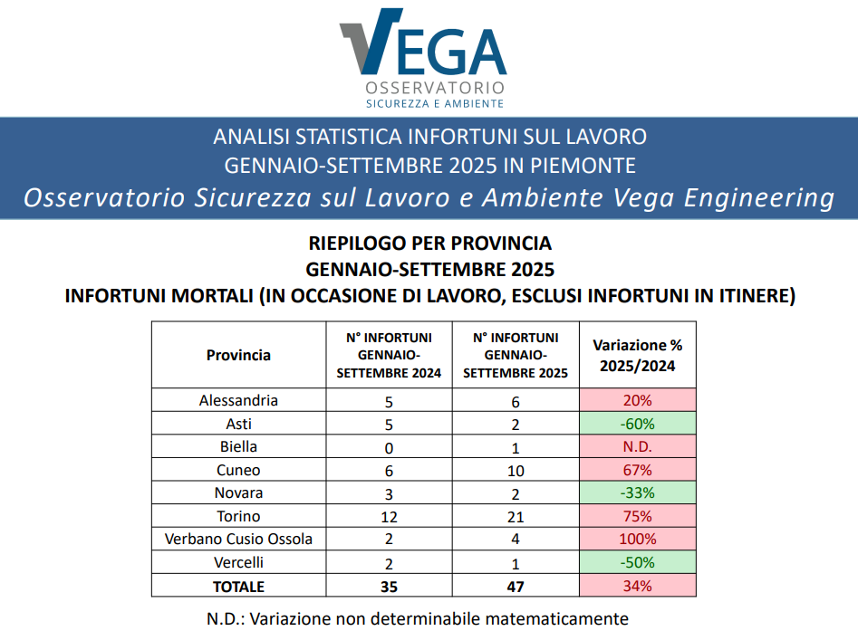 “L’indice di incidenza piemontese raggiunge 25,3 morti per milione di occupati, superando la media italiana di 24. È un campanello d’allarme: servono misure mirate, più vigilanza e formazione”, commenta l’ing. Mauro Rossato, presidente dell’Osservatorio Vega.