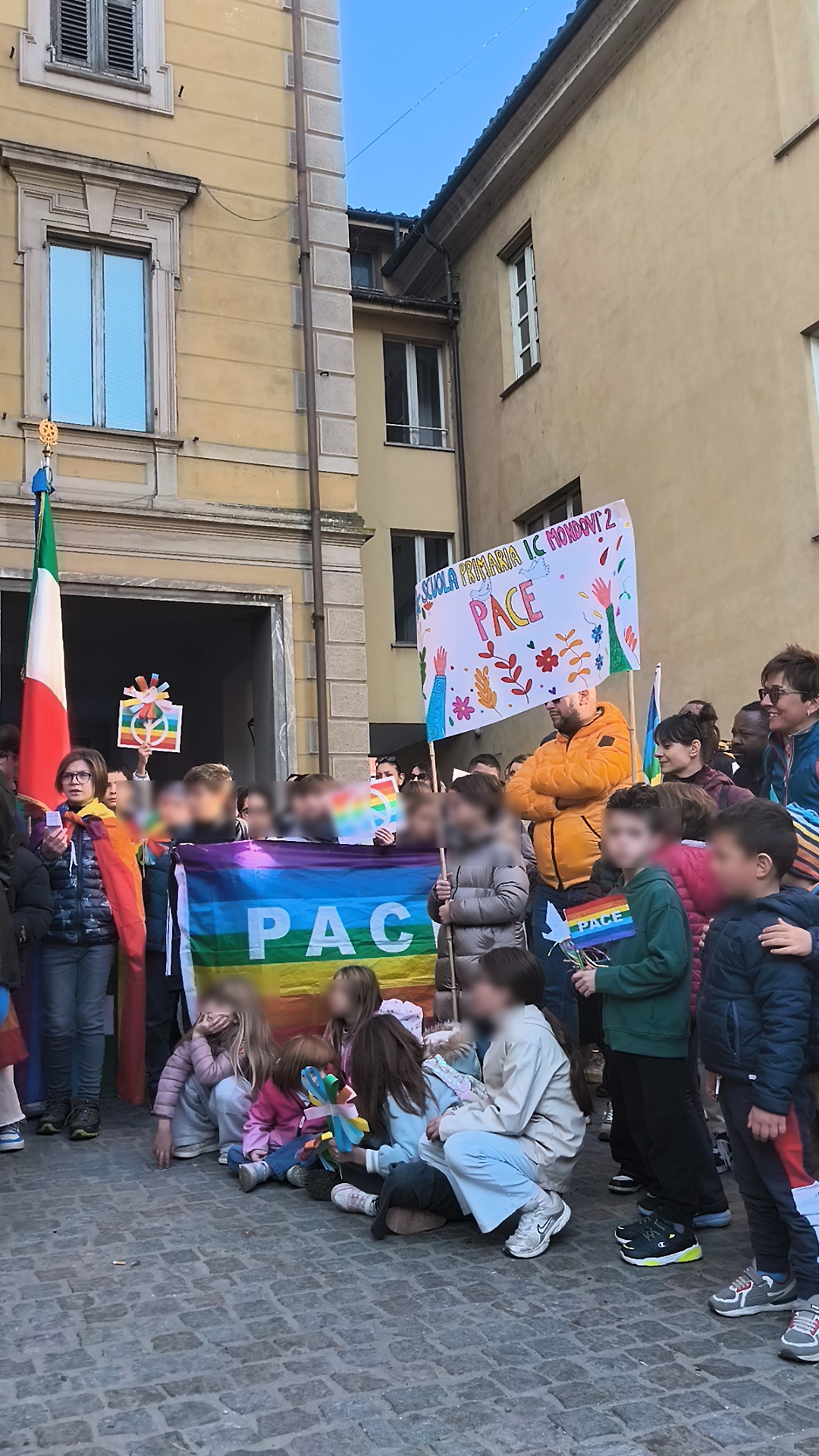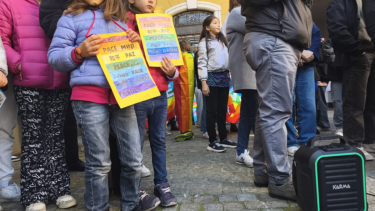 Hanno partecipato centinaia di persone, bambine e bambini di tutte le età, con bandiere arcobaleno e striscioni che ripetevano la parola "PACE" in tante lingue del mondo.