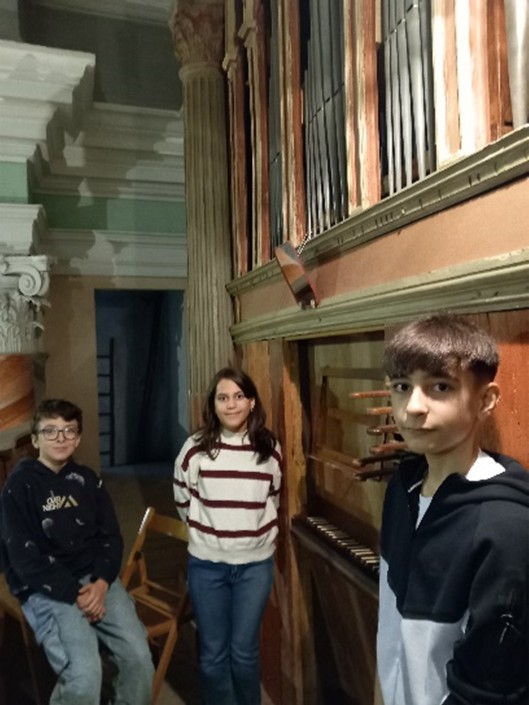 Infine, sopra l’ingresso principale, è collocato un organo del Settecento, racchiuso all’interno di una cassa di legno dipinta e decorata. Caterina, Davide, Giovanni, Luka e Vittoria ne hanno fatto sentire la sonorità, eseguendo brani che hanno spaziato: da “Swanee River” a “Lightly Row”; da “Battellieri dello Yang tze kiang” a “My Heart Will Go On”; da “Hallelujah” di Cohen a “Canzone Argentina”.