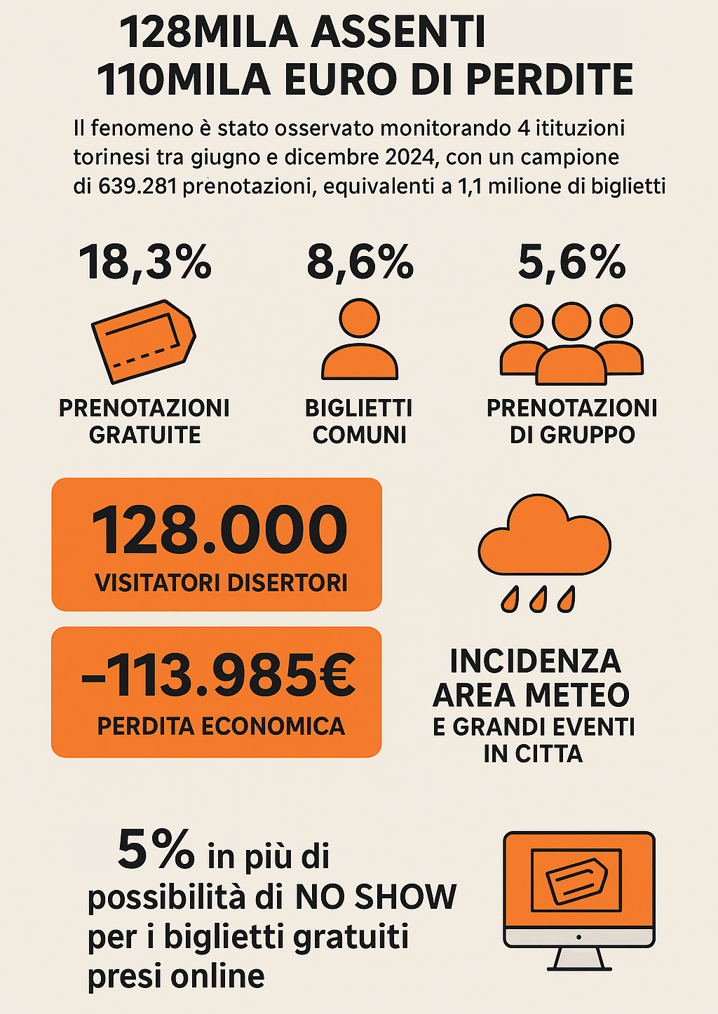Il fenomeno è stato osservato monitorando 4 istituzioni torinesi tra giugno e dicembre 2024, con un campione di 639.281 prenotazioni, equivalenti a 1,1 milione di biglietti. Sono risultati disertori una percentuale del 18,3% delle prenotazioni gratuite, l’8,6% per i biglietti comuni e 5,6% per le prenotazioni di gruppo. In totale, una perdita di circa 128.000 visitatori, con una perdita di 113.985 euro. In particolare, sulle prenotazioni gratuite si è osservata un’incidenza importante del meteo e della concomitanza di grandi eventi in città (ad esempio, le Atp finals). Inoltre, il biglietto gratuito preso online fa osservare un 59% in più di possibilità di no show rispetto all’ingresso in cassa. Altro dato interessante, la percentuale di no show sugli ingressi gratuiti aumenta di molto se la distanza tra la prenotazione e l’evento è grande.