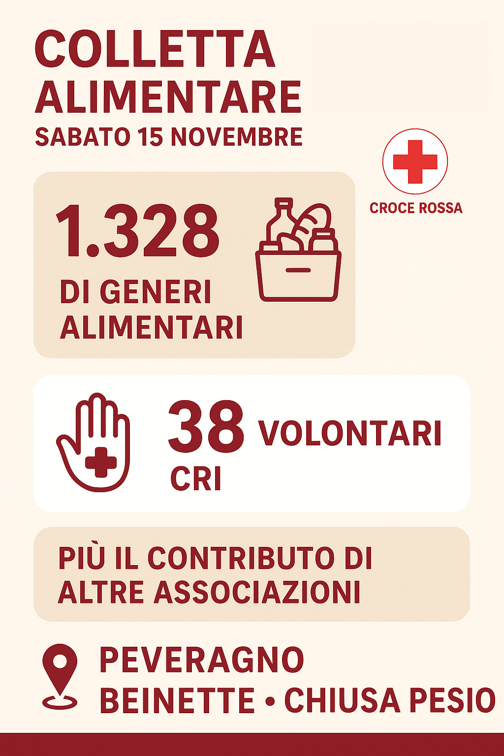 Si è svolta sabato 15 novembre in tutta Italia la Colletta alimentare, promossa dalla Fondazione Banco Alimentare. Anche la Croce Rossa, sezione di Peveragno, si è attivata sul territorio per raccogliere derrate alimentari da destinare ai bisognosi. In totale sono stati raccolti 1328 kg di generi alimentari, con 38 volontari CRI, con il contributo di altre Associazioni, impegnati fin dalla mattina in 6 punti vendita di Peveragno, Beinette e Chiusa Pesio.