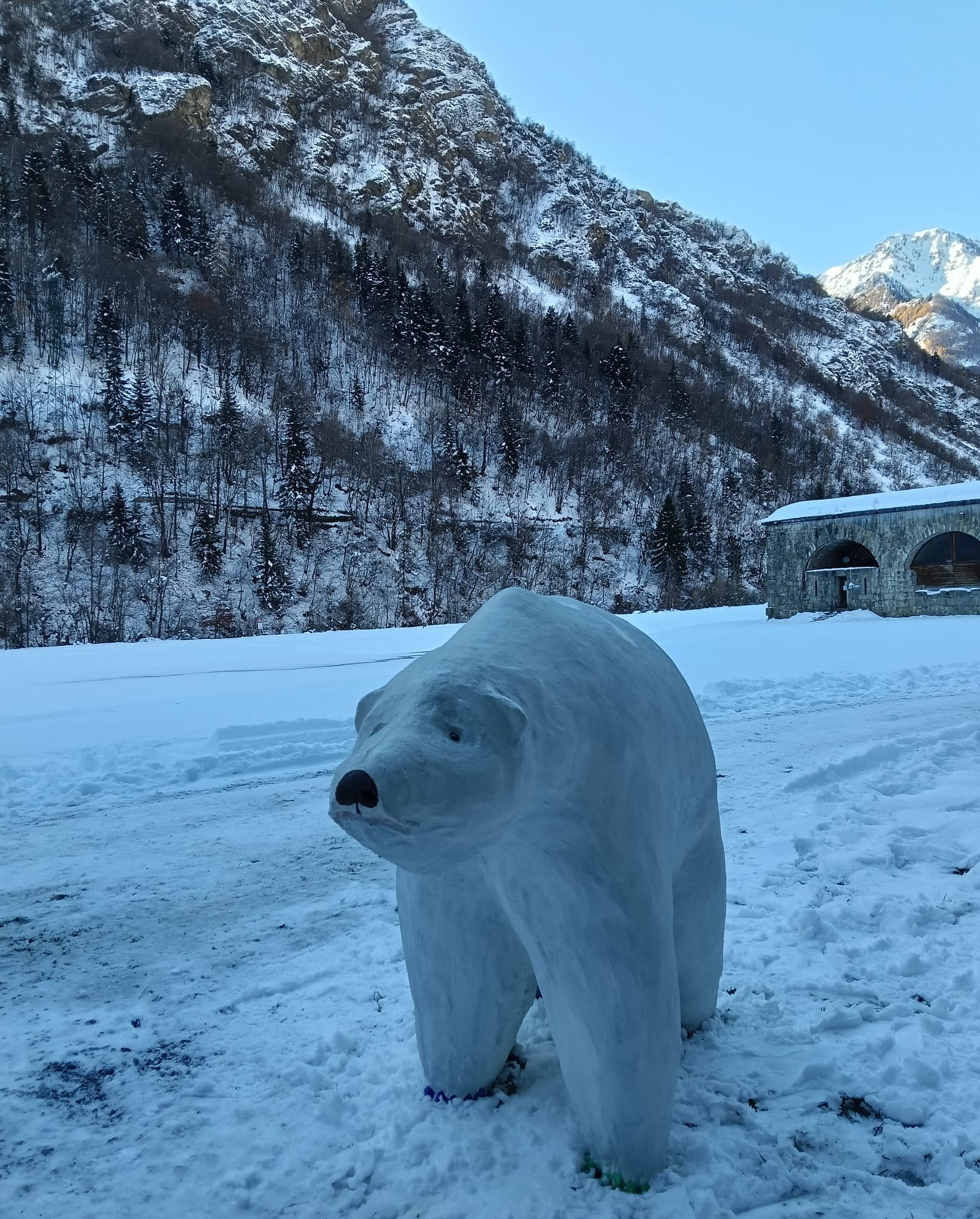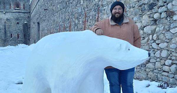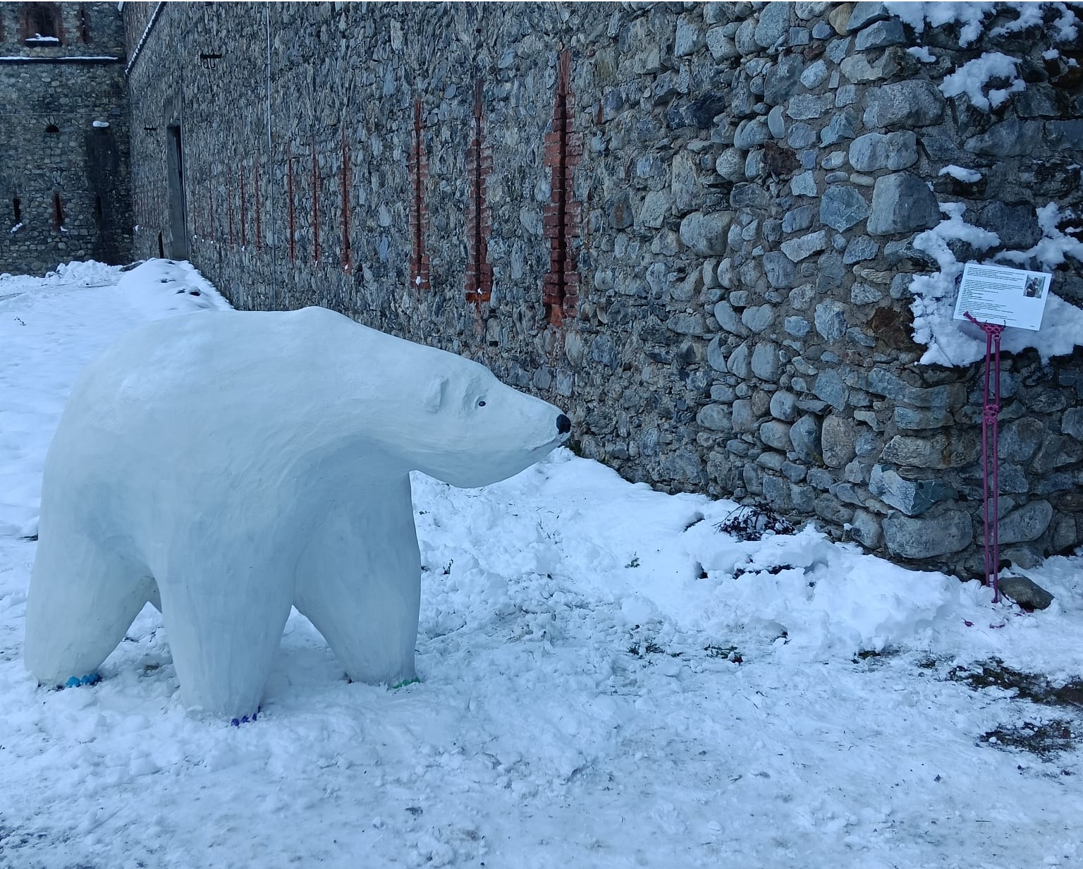 Questa mattina, 25 novembre, avvolto dal silenzio ovattato della neve, è apparso, affacciato sul lago ghiacciato del Forte di Vinadio un colosso bianco: un orso polare a grandezza naturale. Ma non è una creatura scappata da uno zoo, né un misterioso visitatore arrivato fin qui chissà come, dal Polo Nord. Si tratta invece dell’ultima creazione artistica di Andrea Bertone, assessore comunale a Farigliano, che ha modellato la scultura con una speciale malta cementizia, dandogli un aspetto estremamente realistico.