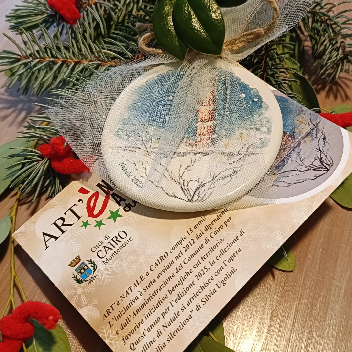 L’edizione 2025 dell’iniziativa “Art’è Natale a Cairo”, avviata nel 2012 dal personale e dagli Amministratori del Comune, prosegue con una nuova produzione. Le palline vengono realizzate in ceramica a cura della ceramista Ilaria Povigna e riproducono fedelmente l’opera ideata dall’Artista Silvia Ugolini intitolata “Vigilia silenziosa” che firma di suo pugno ogni singolo manufatto rigorosamente numerato.