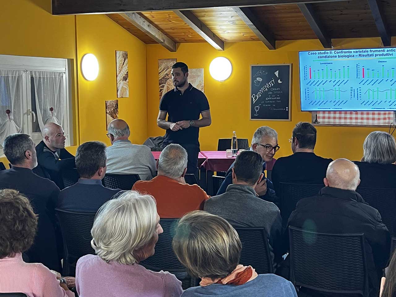 A condurre la serata è stato il dottor Raffaele Meloni, che ha guidato il pubblico in un approfondimento chiaro e coinvolgente sulle principali tipologie di grani oggi coltivabili. L’esperto ha illustrato le caratteristiche dei cultivar moderni, evidenziando al contempo le potenzialità dei grani antichi e dei cereali “minori” – come farro e segale – oggi al centro di un rinnovato interesse da parte del mercato.