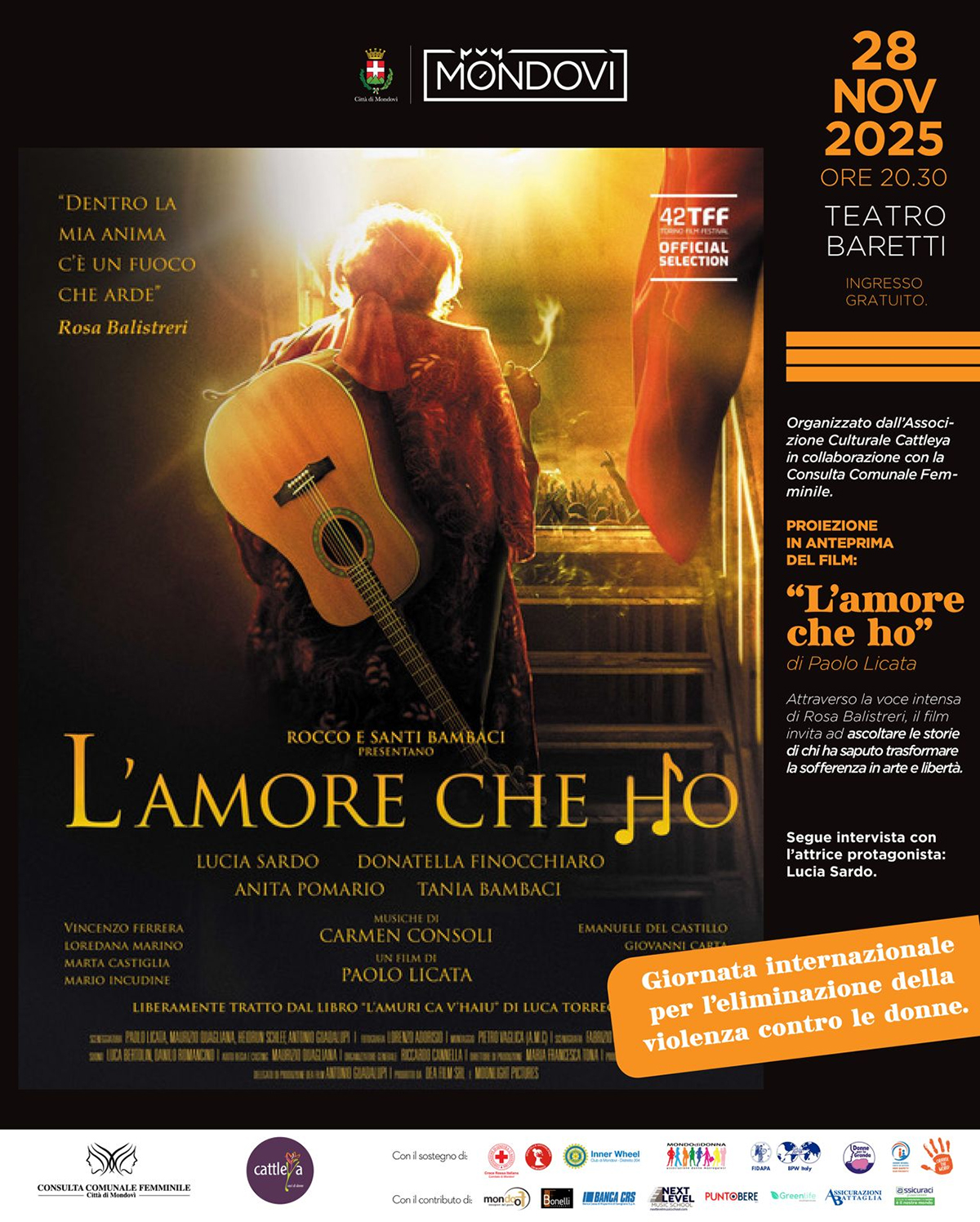 Venerdì 28 novembre, alle ore 20,30, il Coro Cattelya, in collaborazione con la Consulta Comunale Femminile, presenterà in anteprima al Teatro “Baretti” il film “L’amore che ho” di Paolo Licata, ispirato alla vita della cantautrice Rosa Balistreri e liberamente tratto dal libro “L’amuri ca V’haju” scritto da Luca Torregrossa.
