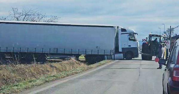 Un tir, durante una manovra, è finito nella cunetta con una ruota posteriore, rimanendo intraversato sulla carreggiata e ostacolando il normale transito dei veicoli. Per tentare di rimuovere il mezzo pesante è intervenuto anche un trattore, impegnato nelle operazioni di traino.