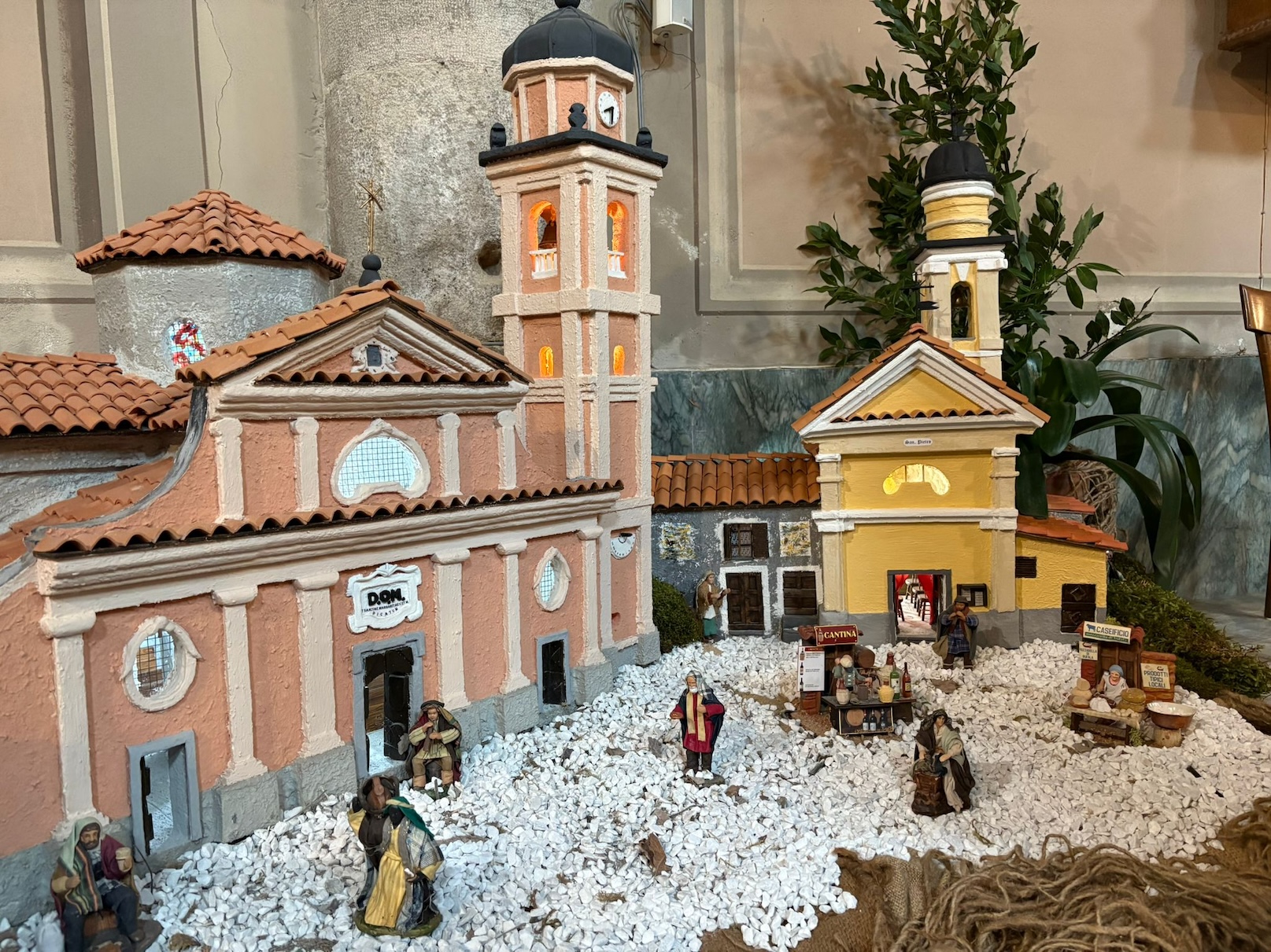 Ma non basta. La rassegna dei presepi prosegue anche in Sant’Antonio dove, nella navata destra, è posizionato l’allestimento artistico di Giovanni Penone che ripropone scorci, monumenti ed edifici più importanti del paese e quest’anno si impreziosisce di un nuovo elemento: la chiesa di San Pietro.