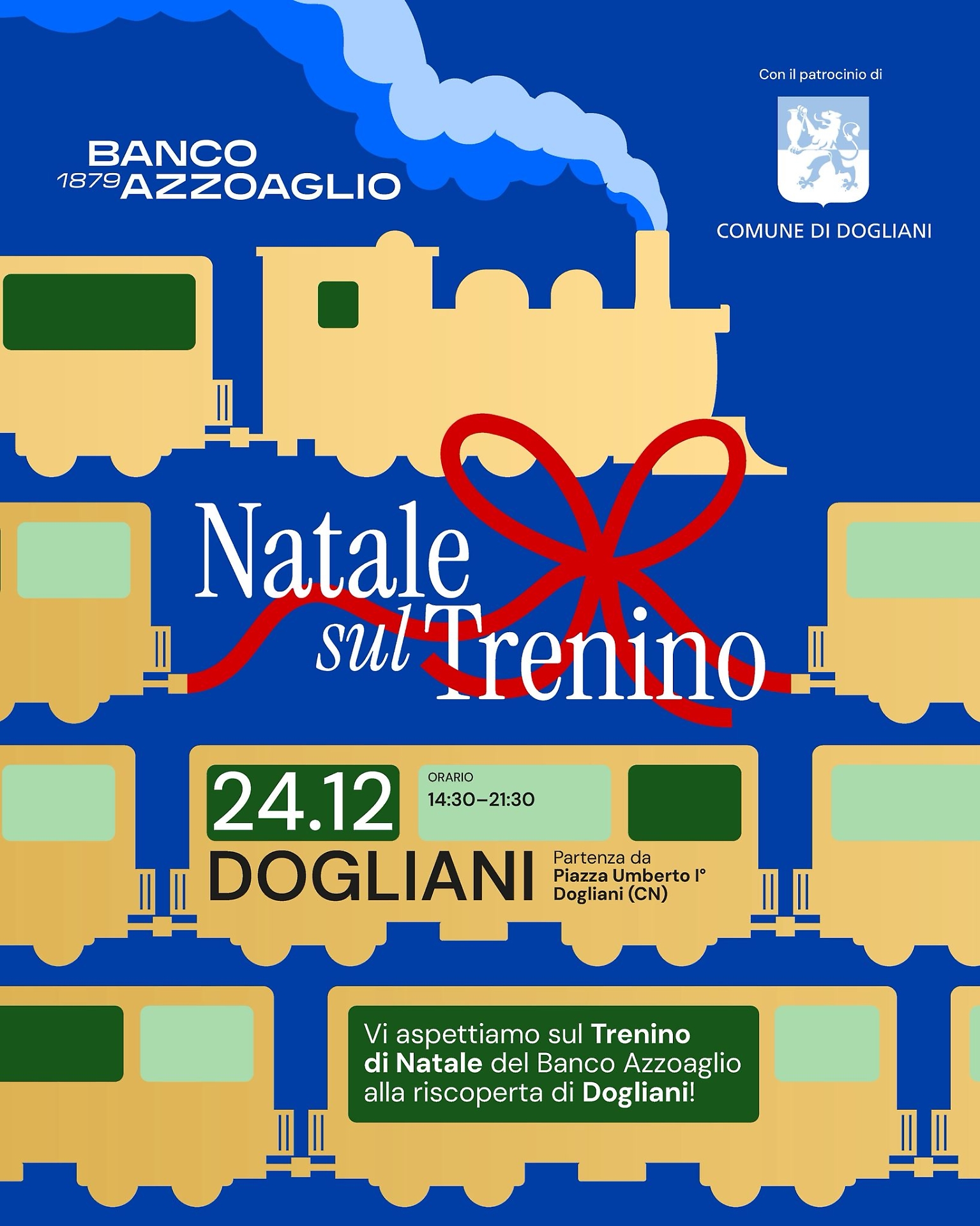 Il trenino di Natale del Banco Azzoaglio fa tappa a Dogliani la vigilia di Natale, mercoledì 24 dicembre.