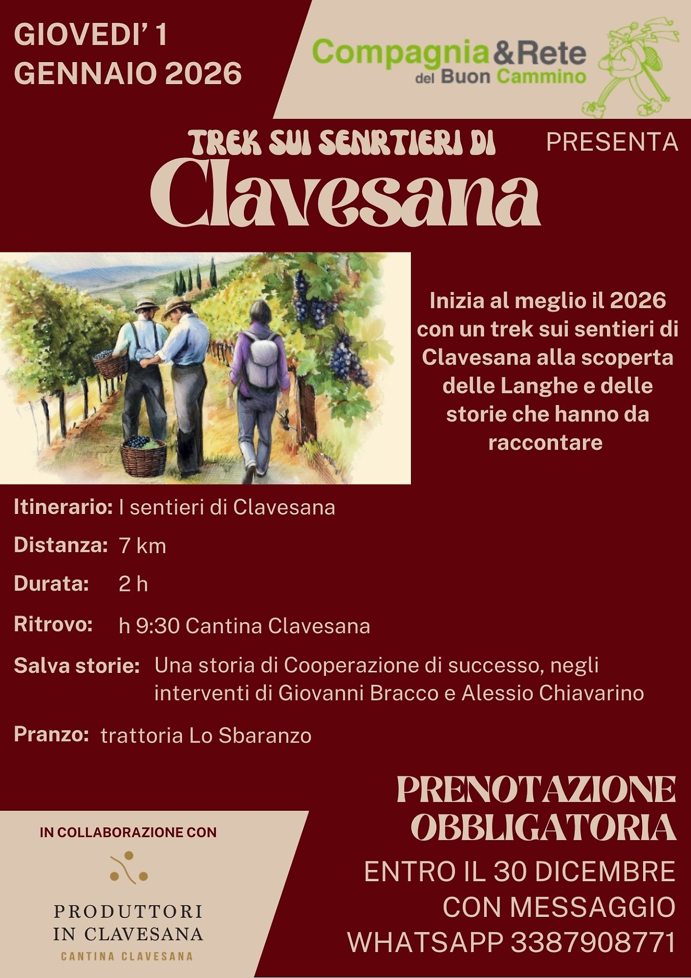 Iniziare l’anno camminando è un augurio che sa di equilibrio, scoperta e lentezza. Giovedì 1° gennaio 2026, la Compagnia & Rete del Buon Cammino propone un suggestivo trek sui sentieri di Clavesana, nel cuore delle Langhe, tra panorami e storie che parlano di territorio e persone.