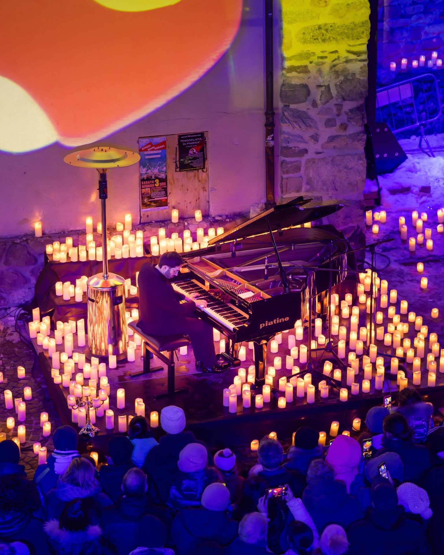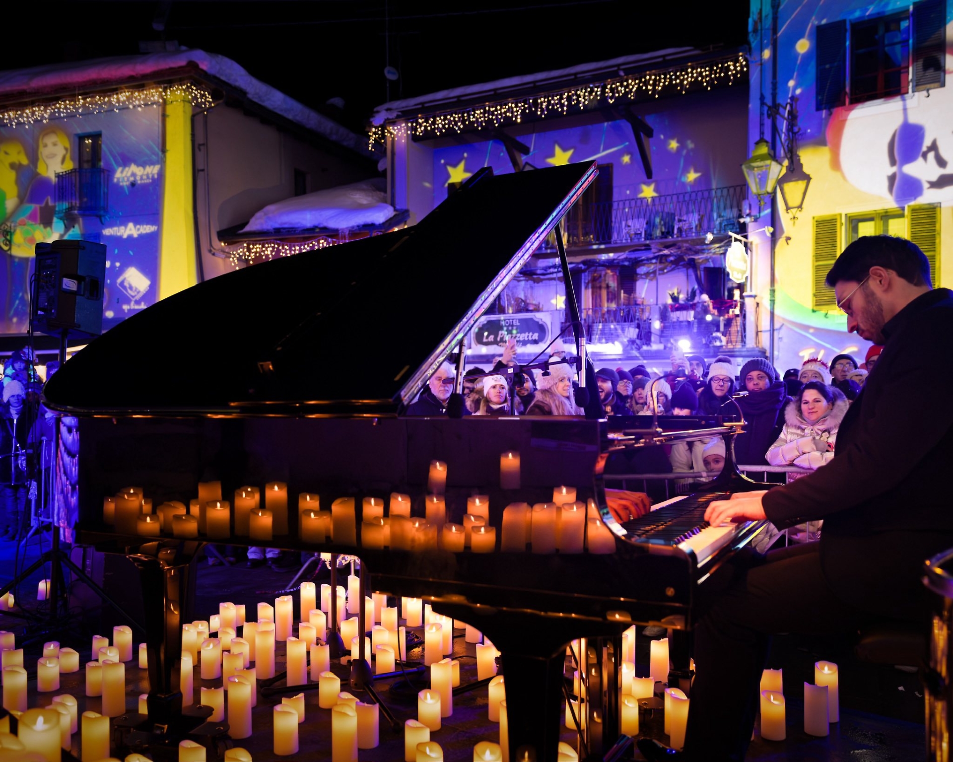 Cuore dell’evento il concerto a lume di candela, con un pianista che ha eseguito canzoni famose e brani natalizi, regalando agli spettatori uno spettacolo emozionante. A rendere ancora più suggestivo il contesto, le proiezioni del Borgo d’Arte e di Luce sulle facciate degli edifici: installazioni e giochi di luce firmati dal celebre artista Marco Lodola hanno contribuito a creare un’atmosfera immersiva e coinvolgente.
