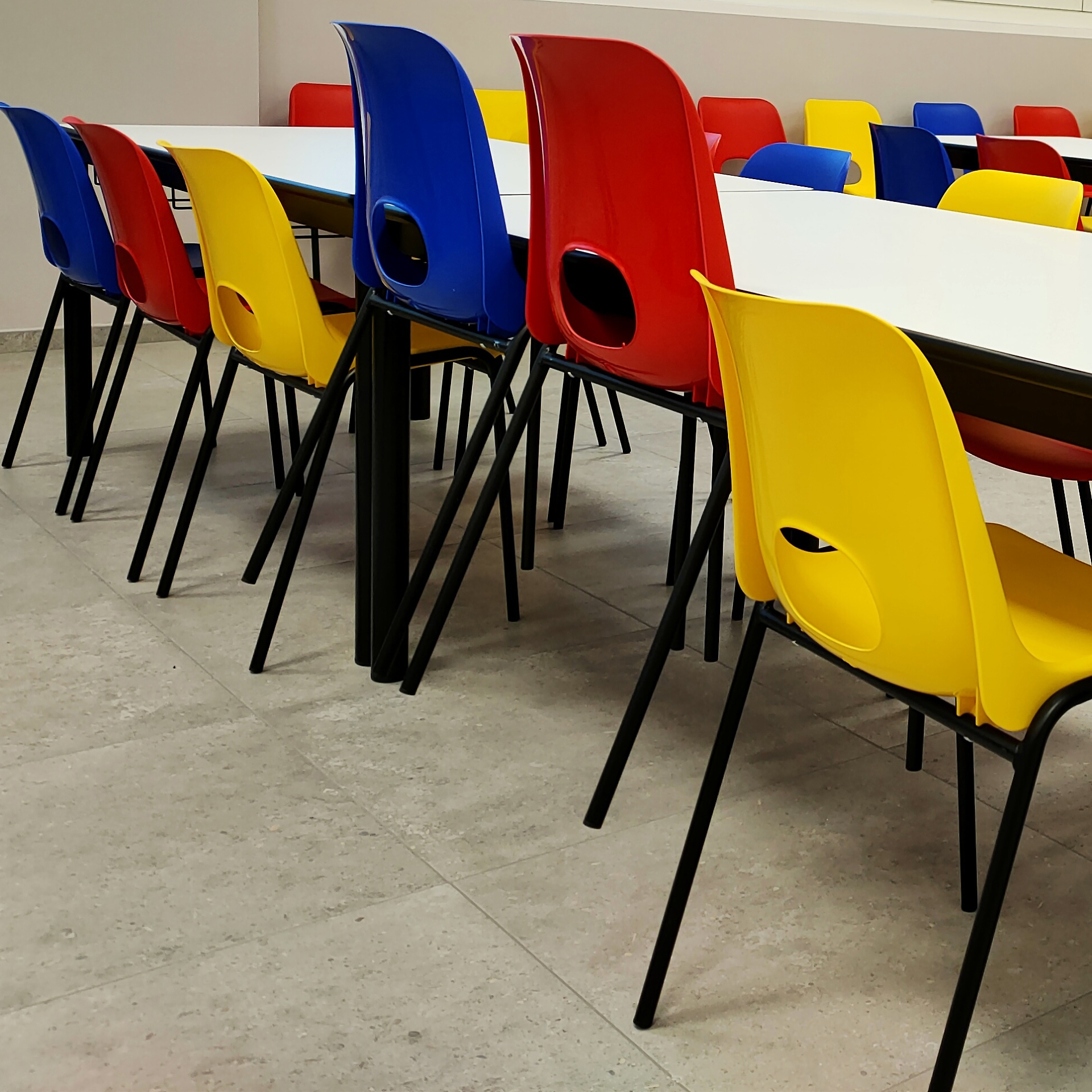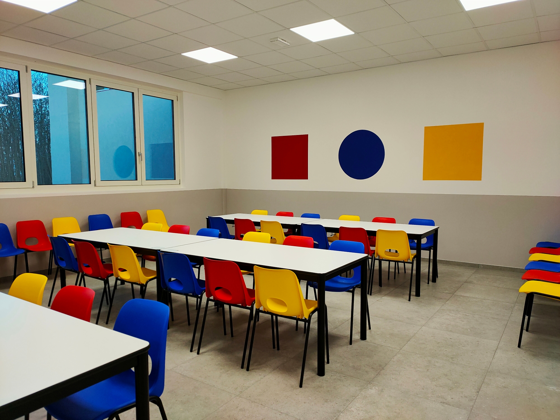 Una curiosità: sotto i tavoli sono stati previsti dei piccoli binari, per poter ritirare le sedie sollevate e facilitare le operazioni di pulizia.