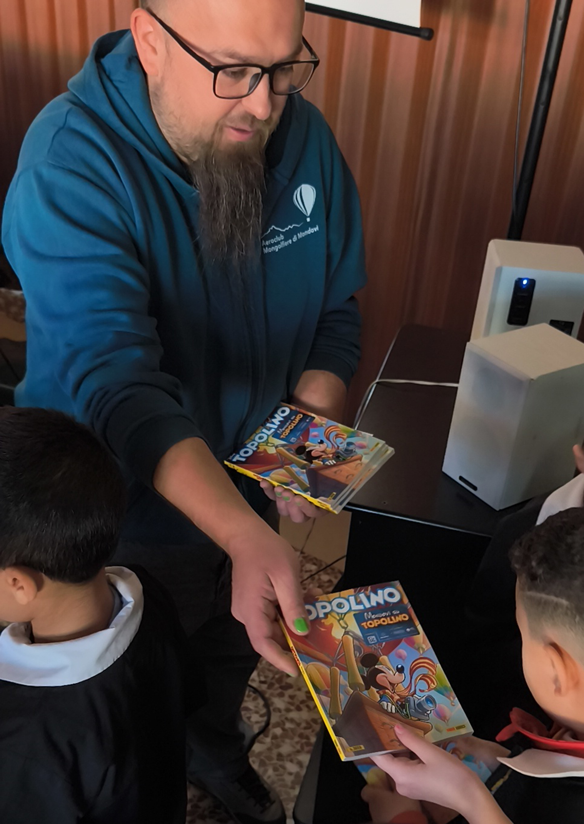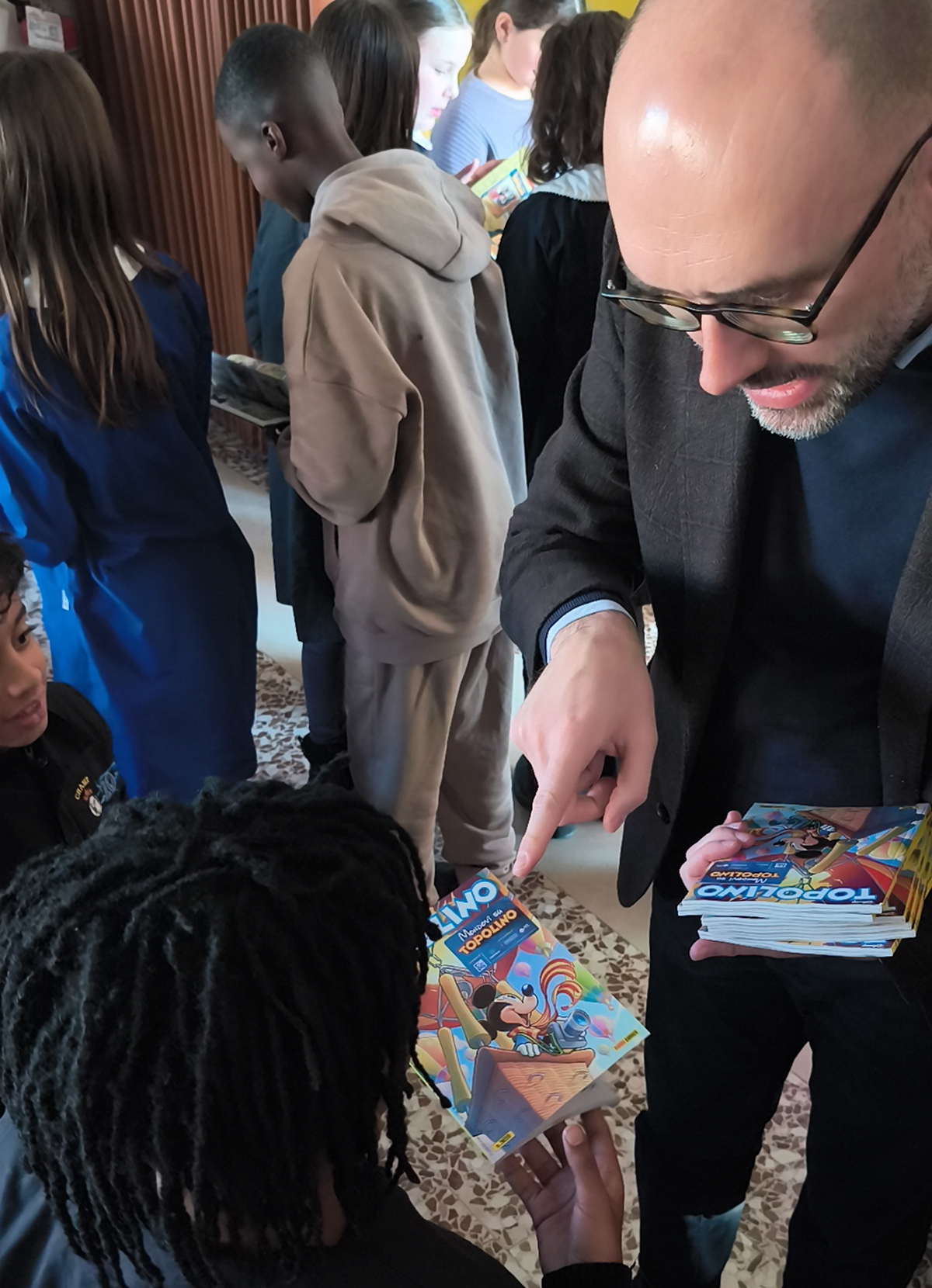 Questa mattina il sindaco di Mondovì e tutti i membri della Giunta hanno consegnato migliaia di copie del numero di "Topolino" alle scuole, una per ogni alunno e alunna di Elementari e Medie. Nei plessi dell'Altipiano - la Primaria "Calleri" e la secondaria "Cordero" - erano presenti il sindaco Luca Robaldo e l'assessora Francesca Bertazzoli e, al loro fianco, il presidente dell'Aeroclub Giorgio Bogliaccino.