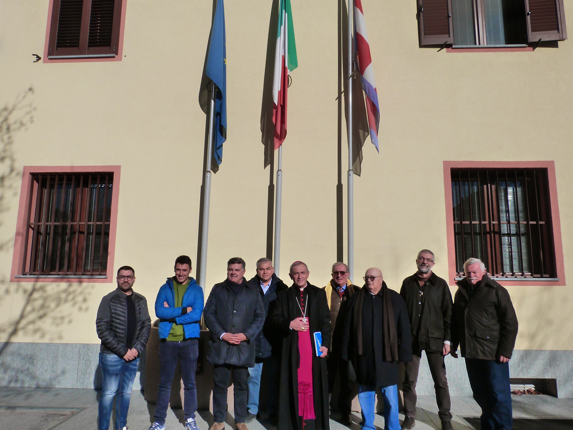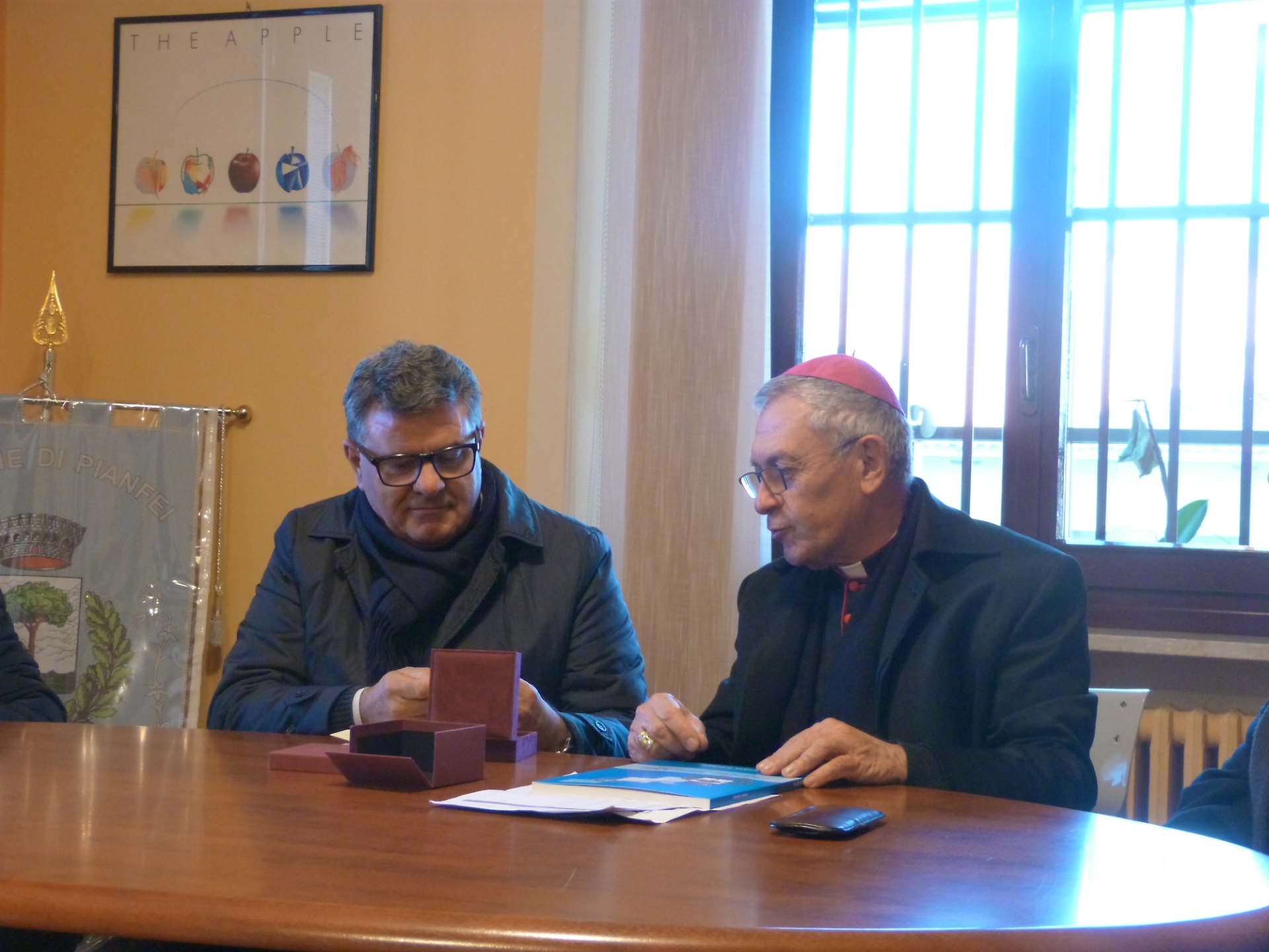 Dopo la Messa, mons. Miragoli si è spostato verso il Municipio di Pianfei dove è stato accolto dal sindaco Marco Turco, dal vicesindaco Mario Rocca e da alcuni consiglieri dell'Amministrazione, oltre che dall'ex consigliere Piergiorgio Fulcheri. Nel corso dell'incontro, il vescovo ha visitato la Casa comunale, soffermandosi sul buon numero di giovani che compone la popolazione del paese e sui progetti dedicati al sociale dall'Amministrazione. In particolare, si è parlato del Condominio Sociale "Casa di Mosè": il sindaco e il vice hanno avuto modo di illustrare nel dettaglio il progetto, oggi una realtà consolidata e ancora abbastanza unica nel panorama provinciale, e il suo funzionamento. La chiacchierata ha toccato anche il progetto, di recente realizzazione, dello spazio dedicato ai giovani del paese, PianTeen. Infine, l'Amministrazione ha omaggiato mons. Miragoli con la pubblicazione dell'ex sindaco Gianni Salvagno dedicata alla storia del paese. Il vescovo ha ricambiato l'omaggio con la medaglia bronzea coniata in occasione dell'inaugurazione della nuova Cattedra nel duomo a Mondovì Piazza.