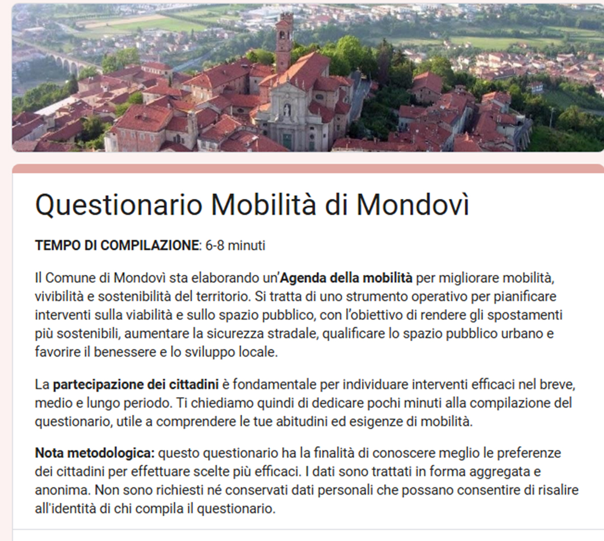 L’iniziativa si inserisce all’interno del percorso di stesura dell’Agenda della Mobilità della città di Mondovì, un documento pensato per supportare l’Amministrazione comunale nelle scelte strategiche e pianificatorie legate alla mobilità locale, nell’ottica di migliorare la qualità dello spazio pubblico, di ridurre l’incidentalità e di accrescere la sostenibilità e la vivibilità urbana. Il questionario è disponibile al seguente link: https://bit.ly/49BlcFs