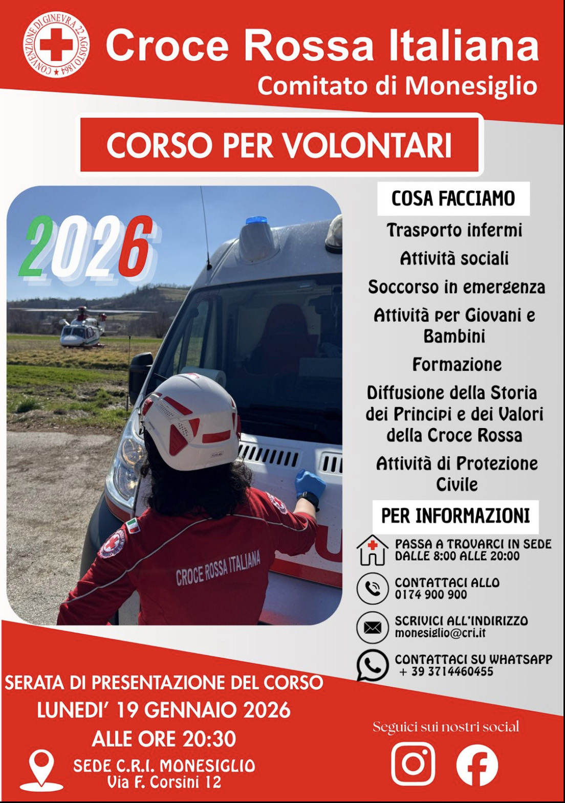 Lunedì 19 gennaio 2026 alle 20.30, nella sede della Croce Rossa di Monesiglio in via Corsini 12, succederà qualcosa di semplice ma decisivo: si apriranno le porte a chi vuole diventare volontario. È l’avvio del nuovo corso di accesso alla Croce Rossa Italiana, un passo fondamentale per rinnovare e rafforzare un comitato che – da decenni – tiene in piedi servizi essenziali per tutto il territorio.