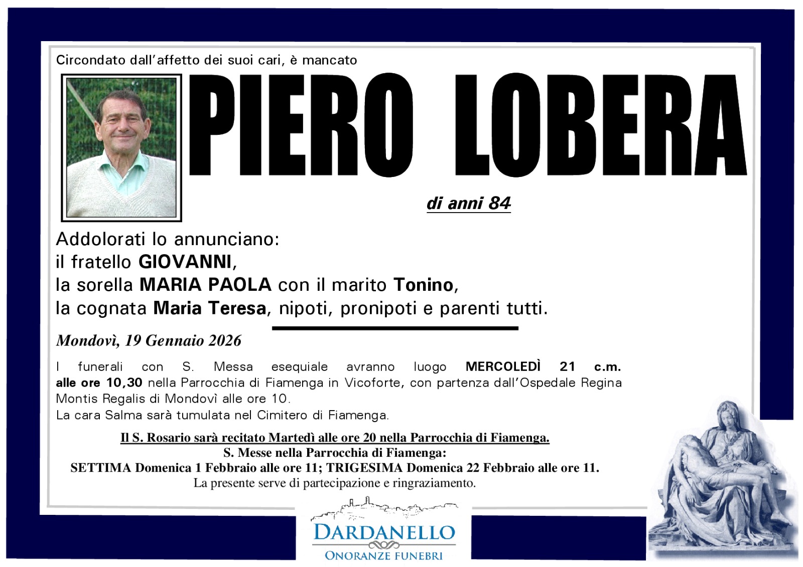 Piero Lobera lascia i fratelli Paola, con il marito Tonino, e Giovanni e i tanti nipoti: Marco, Giovanni, Luca, Sandra, Cristina, Daniela, Monica e Andrea. A loro, ai parenti, e a tutta la grande famiglia sportiva di Mondovì Piazza, va l’abbraccio di un’intera comunità.