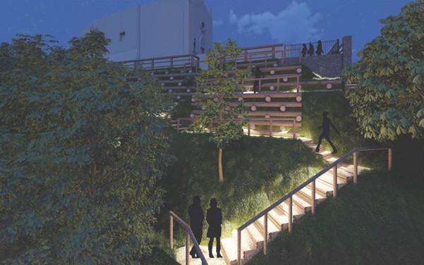 Il progetto prevede inoltre la realizzazione di una scalinata che ripercorrerà l’antico sentiero che si inerpicava dal pilone votivo sottostante fino al piccolo piazzale di ingresso al Santuario. Anche la scalinata sarà realizzata con materiali naturalistici, integrati con la vegetazione esistente, e sarà dotata di un’adeguata illuminazione a LED a basso consumo, con tonalità cromatiche coerenti con il contesto naturale.