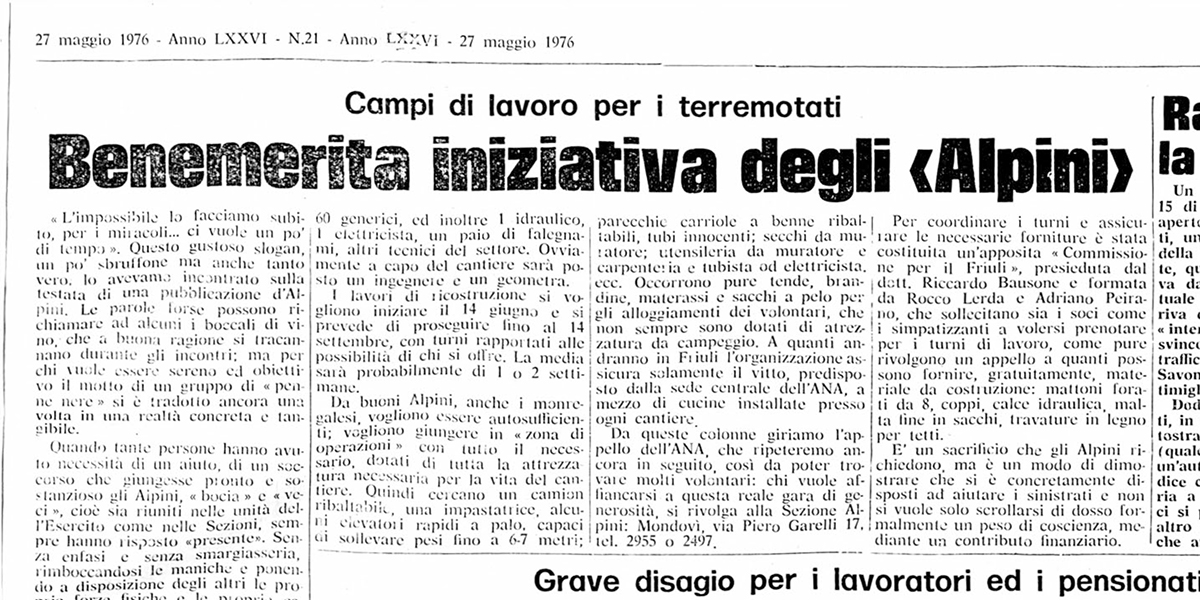 Oggi, a 50 anni, le Penne nere ricordano quei giorni. Sabato 24 gennaio, alle 16, nella sala “Scimè” di corso Statuto 11, a Breo, si terrà un incontro dedicato al 50° anniversario del terremoto del Friuli del 1976.