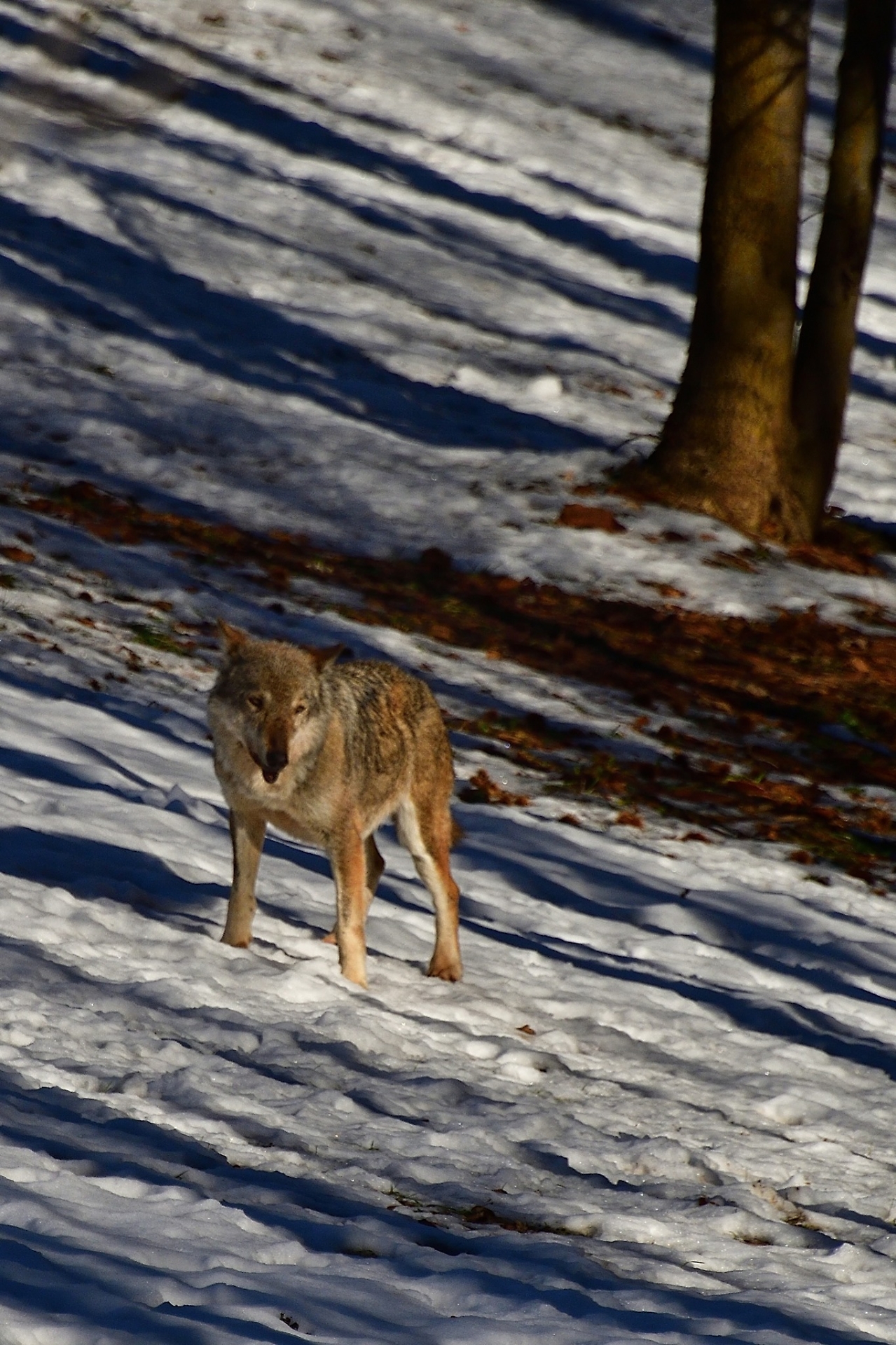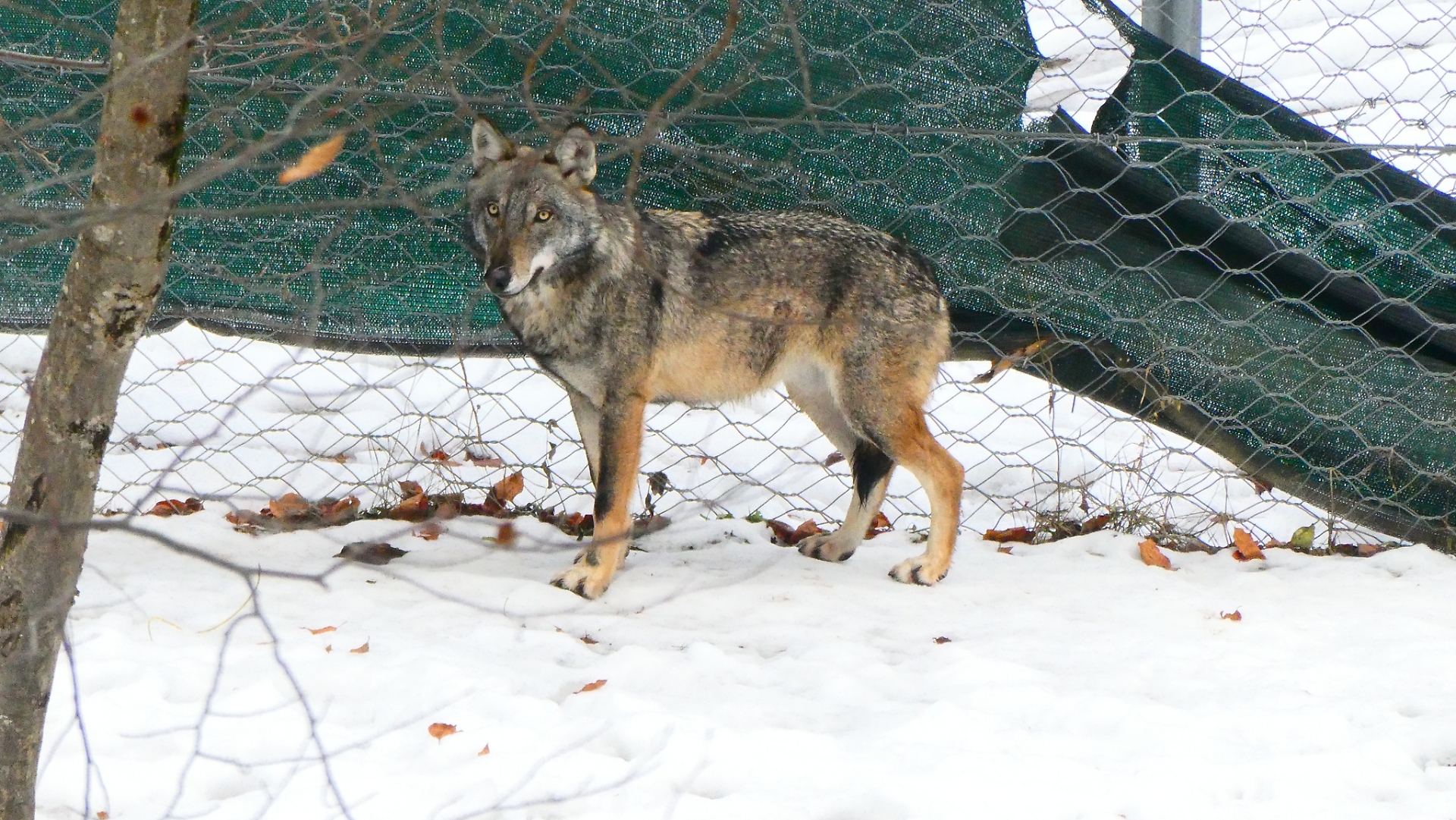 Nell’Area Nord vivono invece Cati, Loup e Castel. Cati si distingue per la silhouette snella e per la mascherina facciale bianca, tipica del Canis lupus. Loup, giovane lupa recuperata in Valle Stura e ospite del centro dall’ottobre 2024, colpisce per lo sguardo intenso e per le bande scure molto marcate sulle zampe anteriori, caratteristiche della sottospecie Canis lupus italicus.