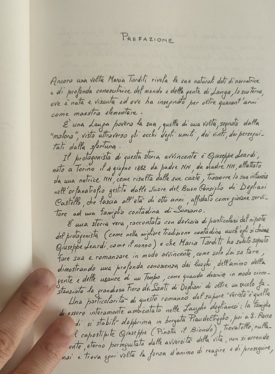 Leardi ha messo a disposizione la sua storia, lei il suo inconfondibile stile di scrittura, in grado di addolcire anche il racconto più crudo. Beppe ha avuto infatti il coraggio di mettere in piazza la storia di suo nonno, “Pinotu il biondo”, venuto al mondo da genitori sconosciuti, nato e morto a Torino pur senza averci mai camminato dentro, chiamato due volte in guerra, adottato da una famiglia di Somano e segnato da tanti lutti.