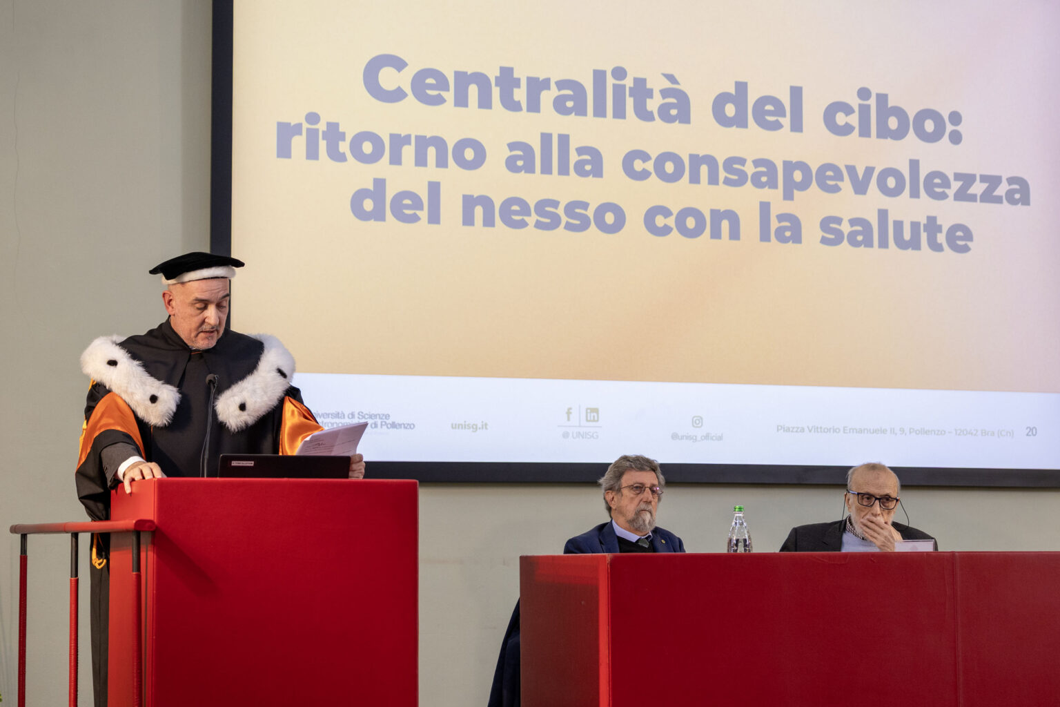 Ha poi affermato: «La relazione del professor Vineis ha messo in luce il tema della biodiversità, ricordandoci che tutto è connesso. Noi a Pollenzo abbiamo dato senso a quanto già aveva intuito Brillat-Savarin, padre della gastronomia moderna occidentale, valorizzando le discipline connesse alla gastronomia. Su questo percorso siamo nati e vi abbiamo dedicato 22 anni di lavoro. Il cibo deve passare da una dimensione semplicemente multidisciplinare a una dimensione centrale. Il cibo è la nostra vita, e concepirlo come centrale richiede consapevolezza. E in riferimento alla bellissima relazione delle due rappresentanti degli studenti, che hanno proposto considerazioni e idee piene di sentimento e di positività, voglio ricordare che il gastronomo del futuro deve essere anche un soggetto politico».