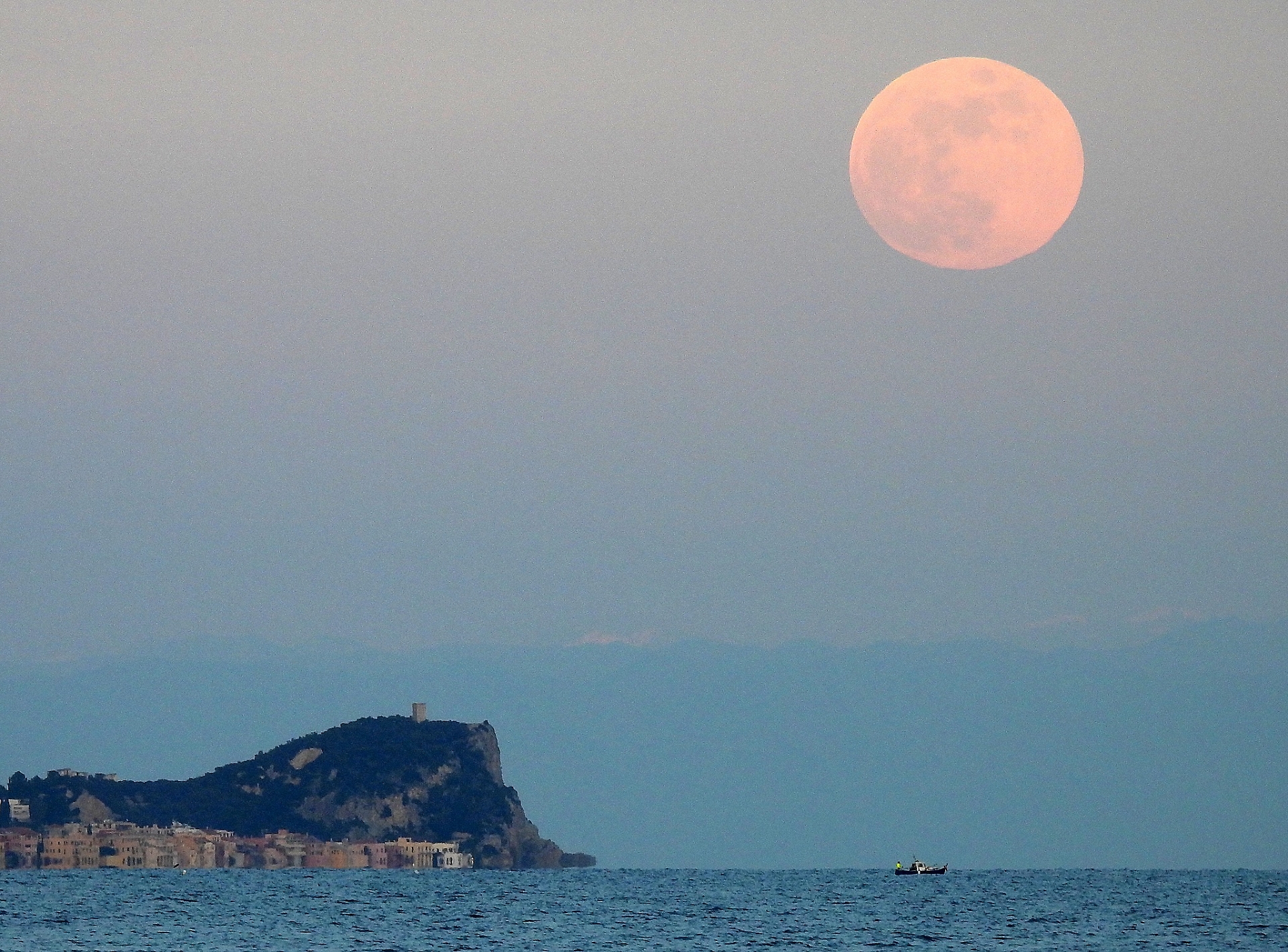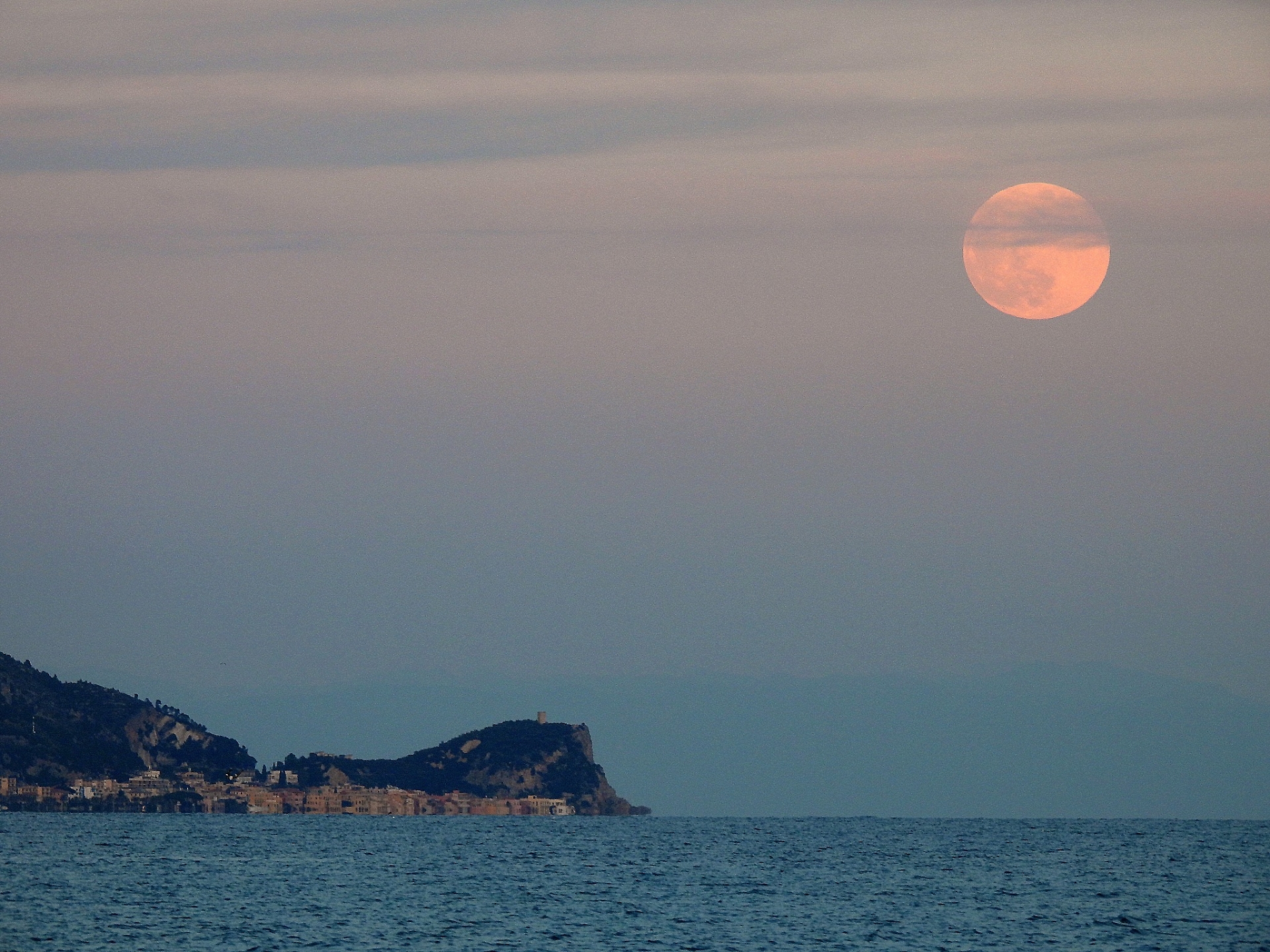 A raccontare questa luna, questa volta, non sono le colline ma il mare. Marco Aimo, fotografo di Carrù, da anni affezionato interprete visivo delle Langhe e del Monregalese, ha scelto – o forse è stato scelto – da uno scenario per lui decisamente inconsueto. Abituato ai profili morbidi delle colline, ai campanili immersi nella nebbia e ai filari che si rincorrono all’orizzonte, Aimo ha puntato il suo obiettivo verso la Liguria, lasciandosi sorprendere dall’incontro tra luna e mare.
