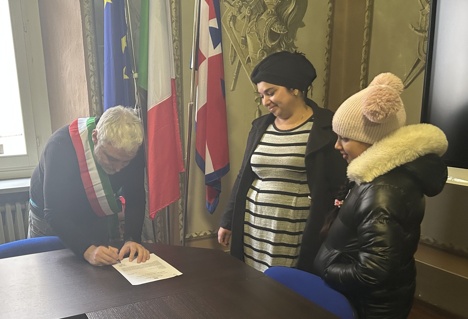 La cerimonia si è svolta nella sala del Consiglio comunale, dove la signora Milouda e la sua famiglia sono state accolte dal sindaco Luca Viglierchio per la sottoscrizione dell’atto ufficiale. Un momento semplice ma intenso, carico di pensieri positivi e di profondo valore simbolico per tutta la comunità.