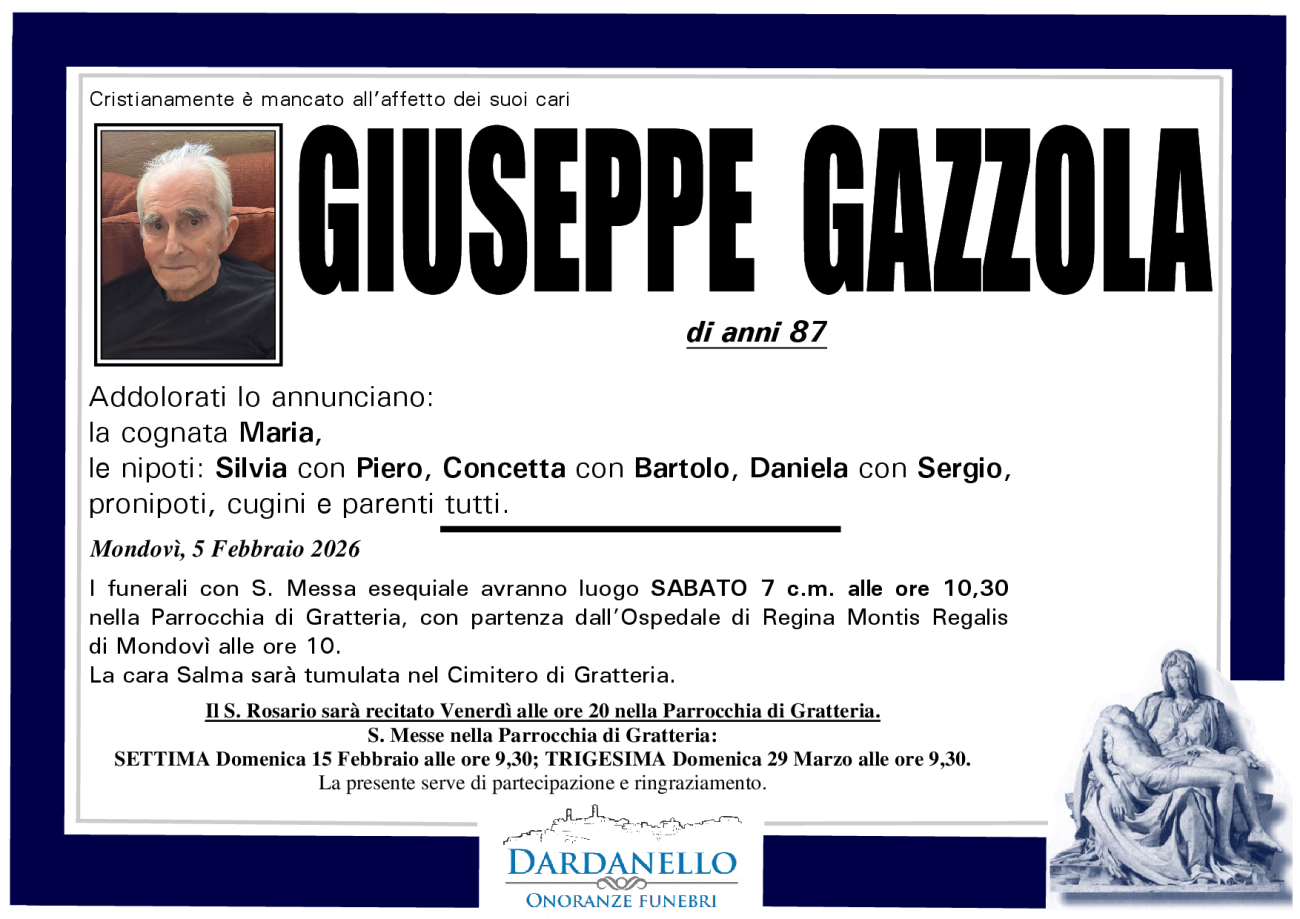 Beppe lascia la cognata Maria, le nipoti Silvia con Piero, Concetta con Bartolo, Daniela con Sergio. I funerali si svolgono sabato 7 febbraio, alle ore 10.30, presso la Parrocchiale di Gratteria a Mondovì.