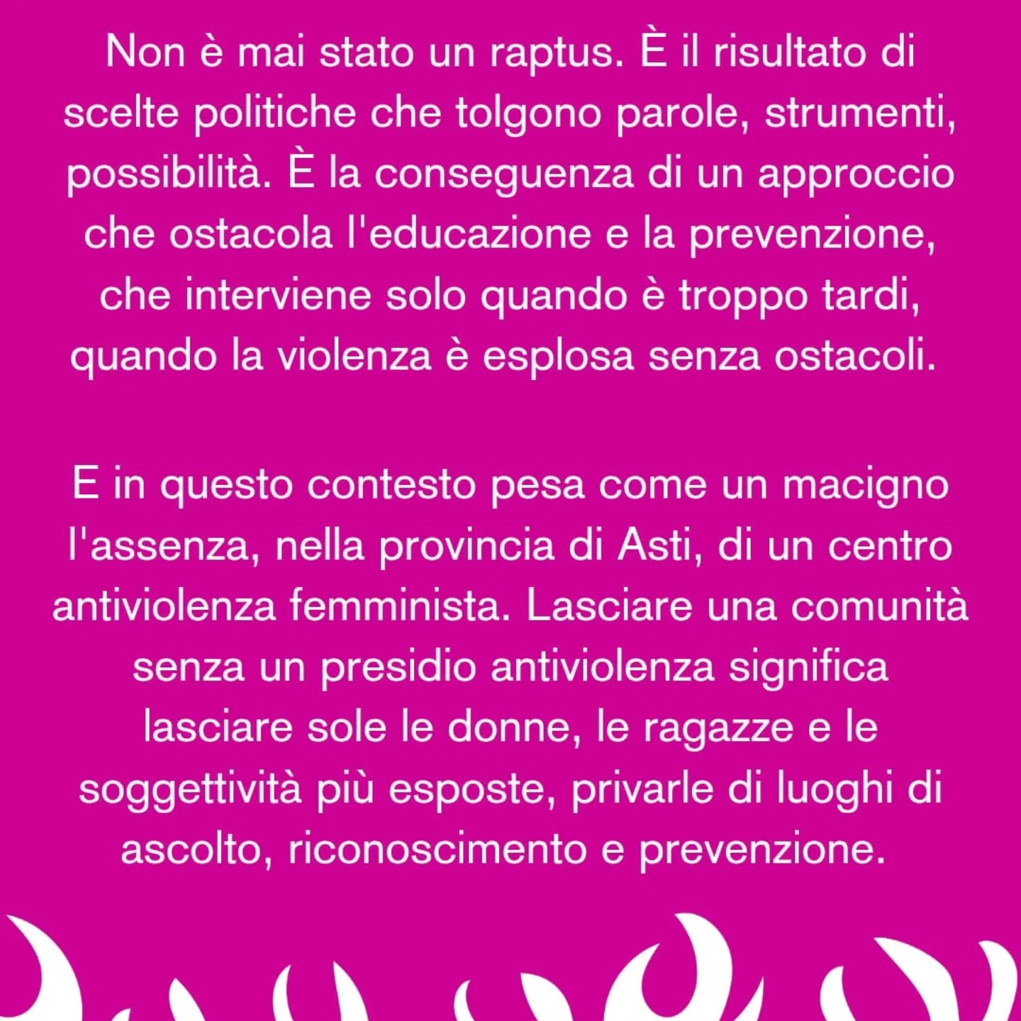 Per Non Una di Meno, il cambiamento passa da un lavoro profondo e continuativo su cultura, linguaggio e relazioni quotidiane. La manifestazione di Asti vuole così diventare non solo un gesto simbolico, ma un invito concreto a costruire una società capace di prevenire la violenza prima ancora che di condannarla.