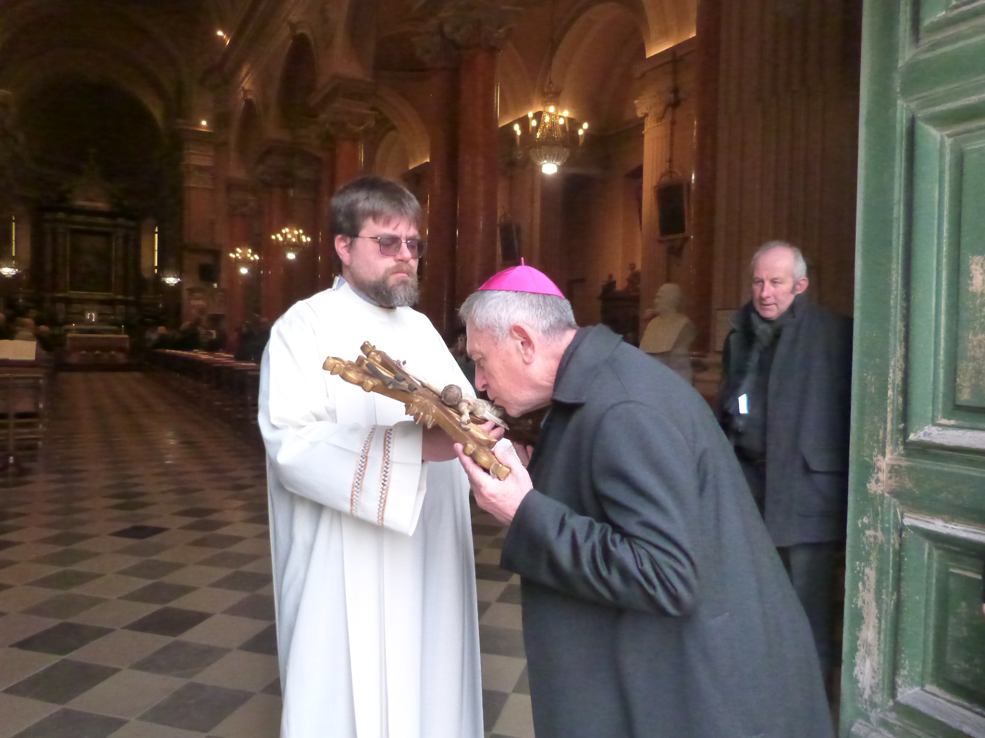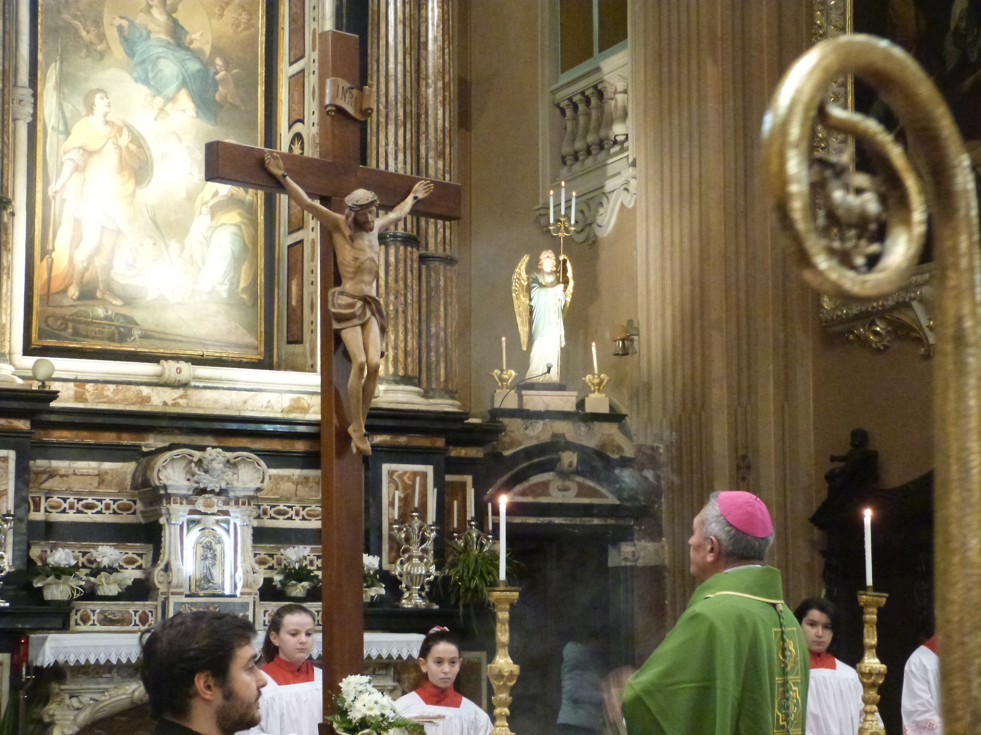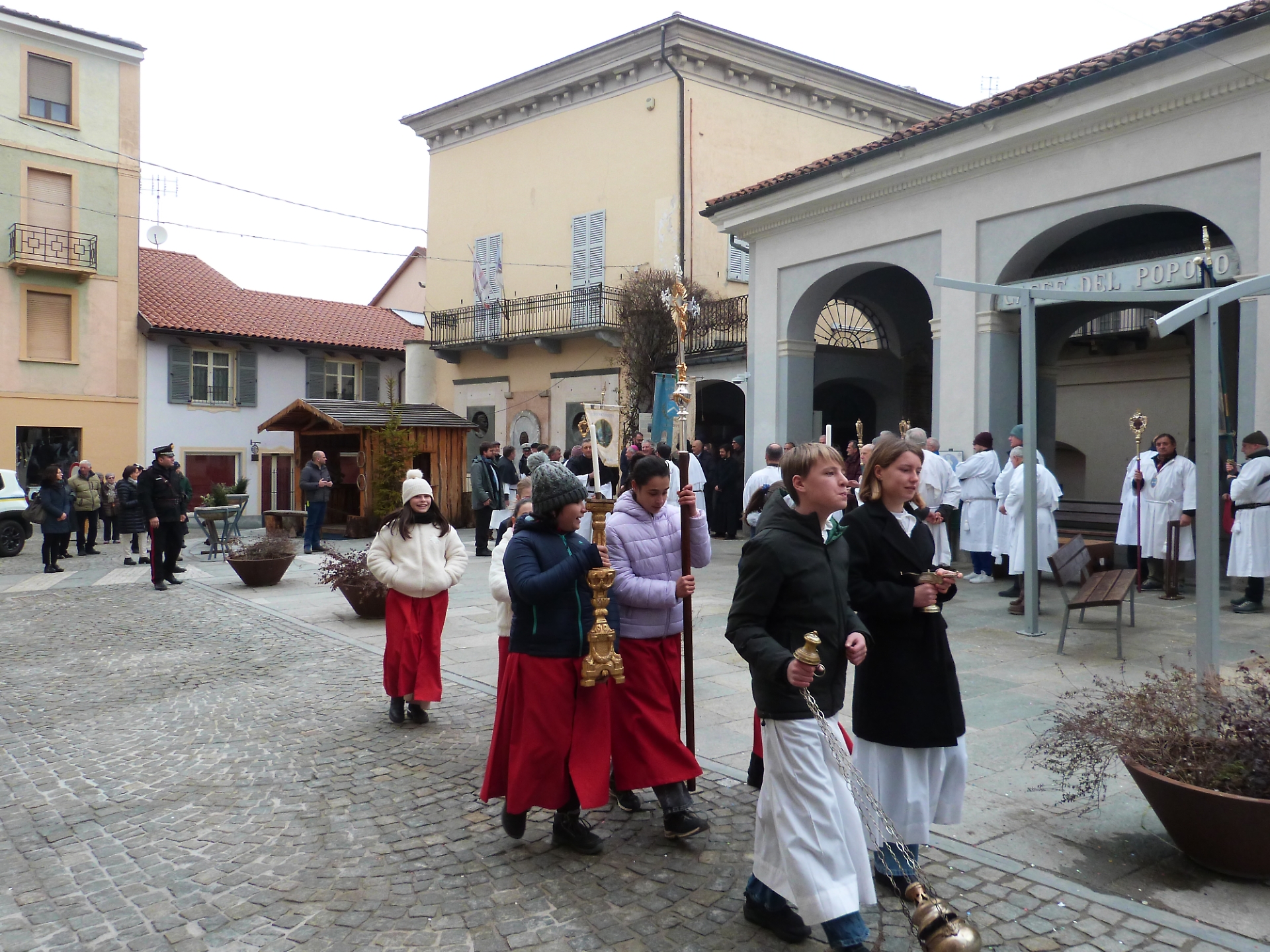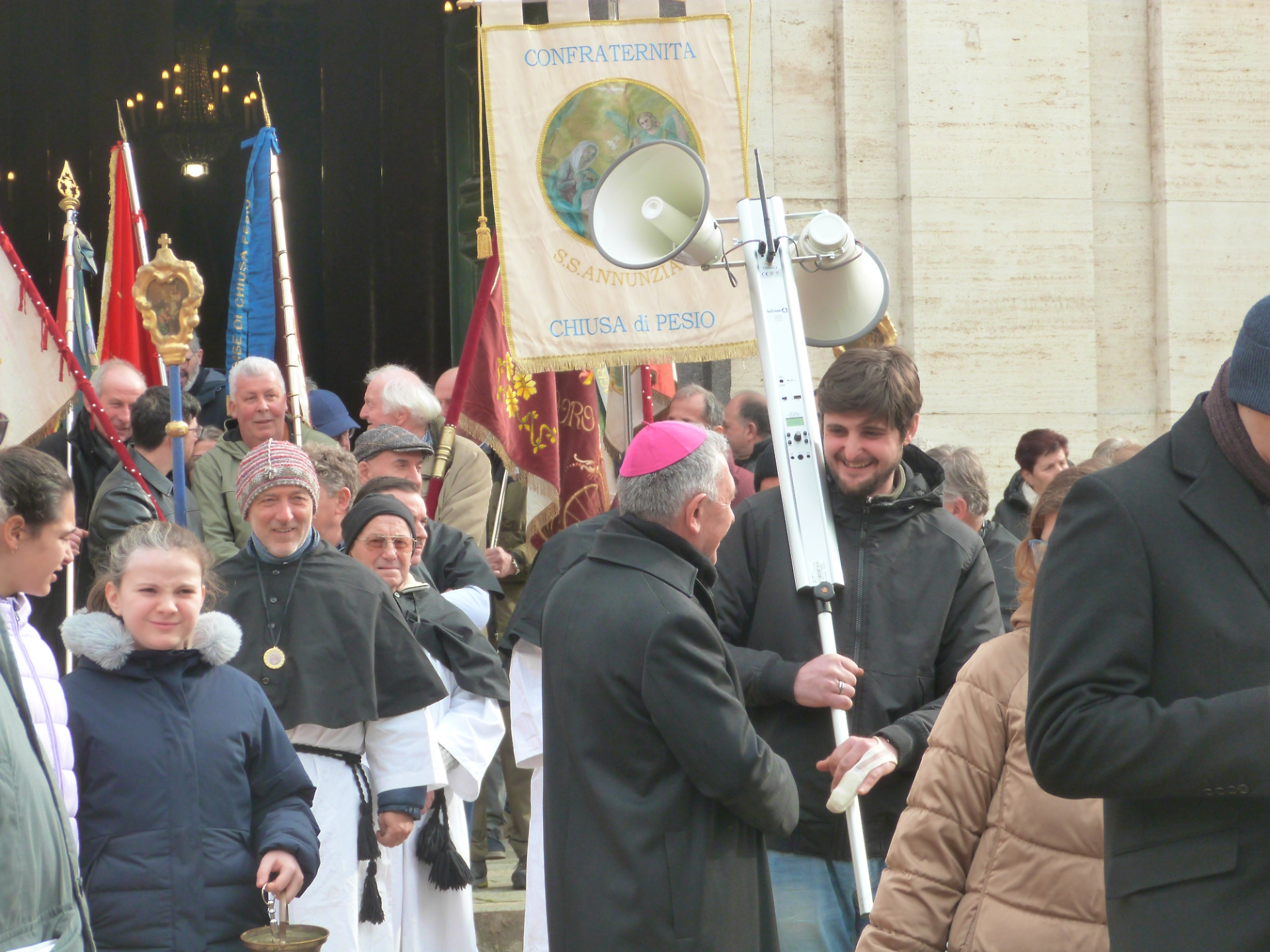Il vescovo ha ricevuto in dono un crocifisso di ceramica, pezzo d’arte realizzato da Aurora Vena, espressione della tradizione artigianale della Valle, ed ha ricambiato con una medaglia bronzea coniata in seguito all’inaugurazione della Cattedra. Successivamente, all’uscita dal Municipio, si è trovato davanti a una piazza gremita di persone: le confraternite, con i loro abiti tradizionali, la Banda musicale in forze, le rappresentanze delle associazioni e tanti chiusani, che lo hanno accompagnato in corteo verso la Parrocchiale di Sant’Antonino, per la Messa.